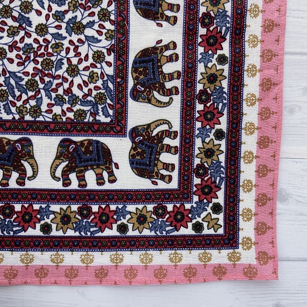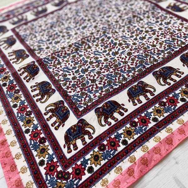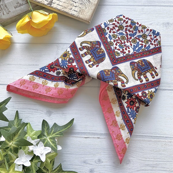 バンダナ インド綿100% 象と花柄 フラワーエレファント ピンク 約52cm×52cm