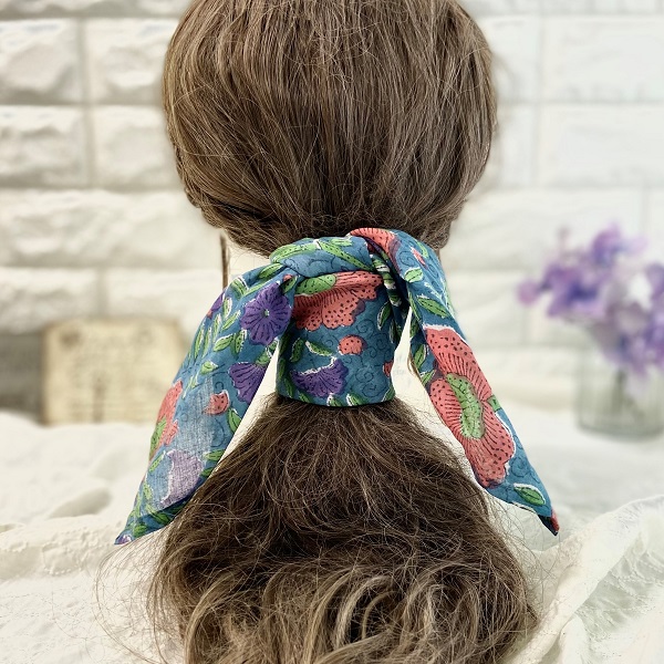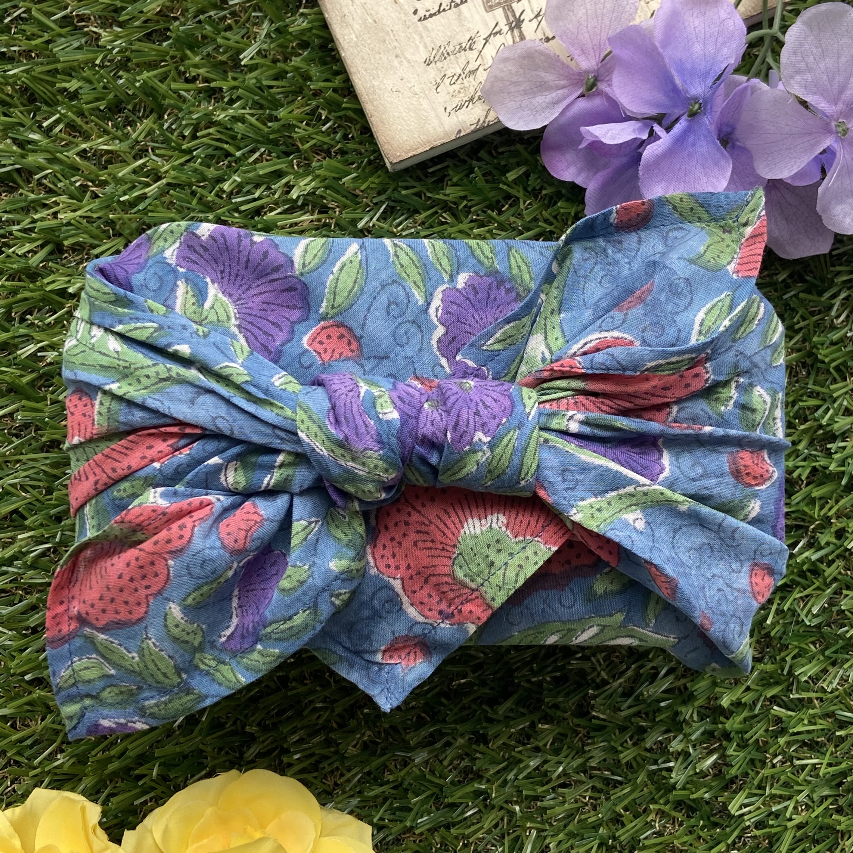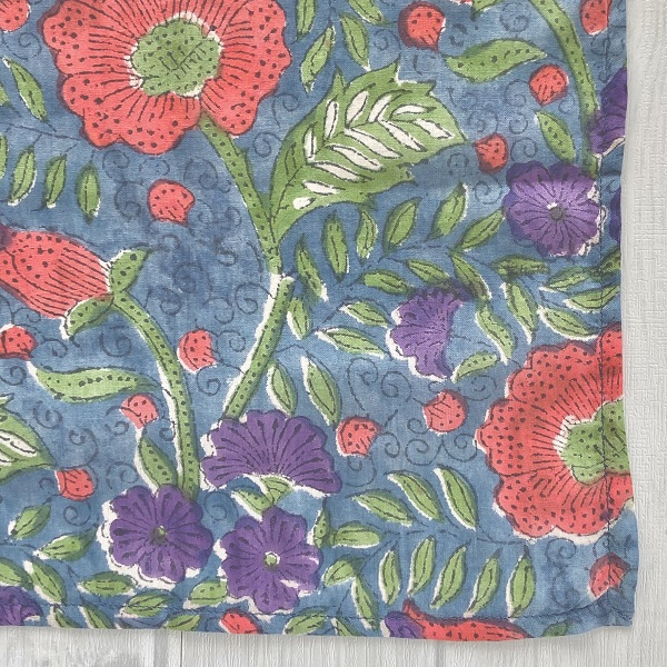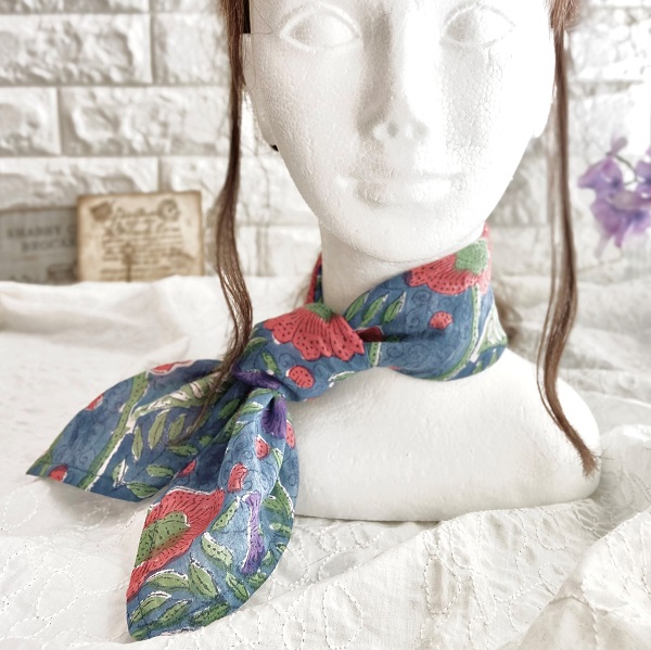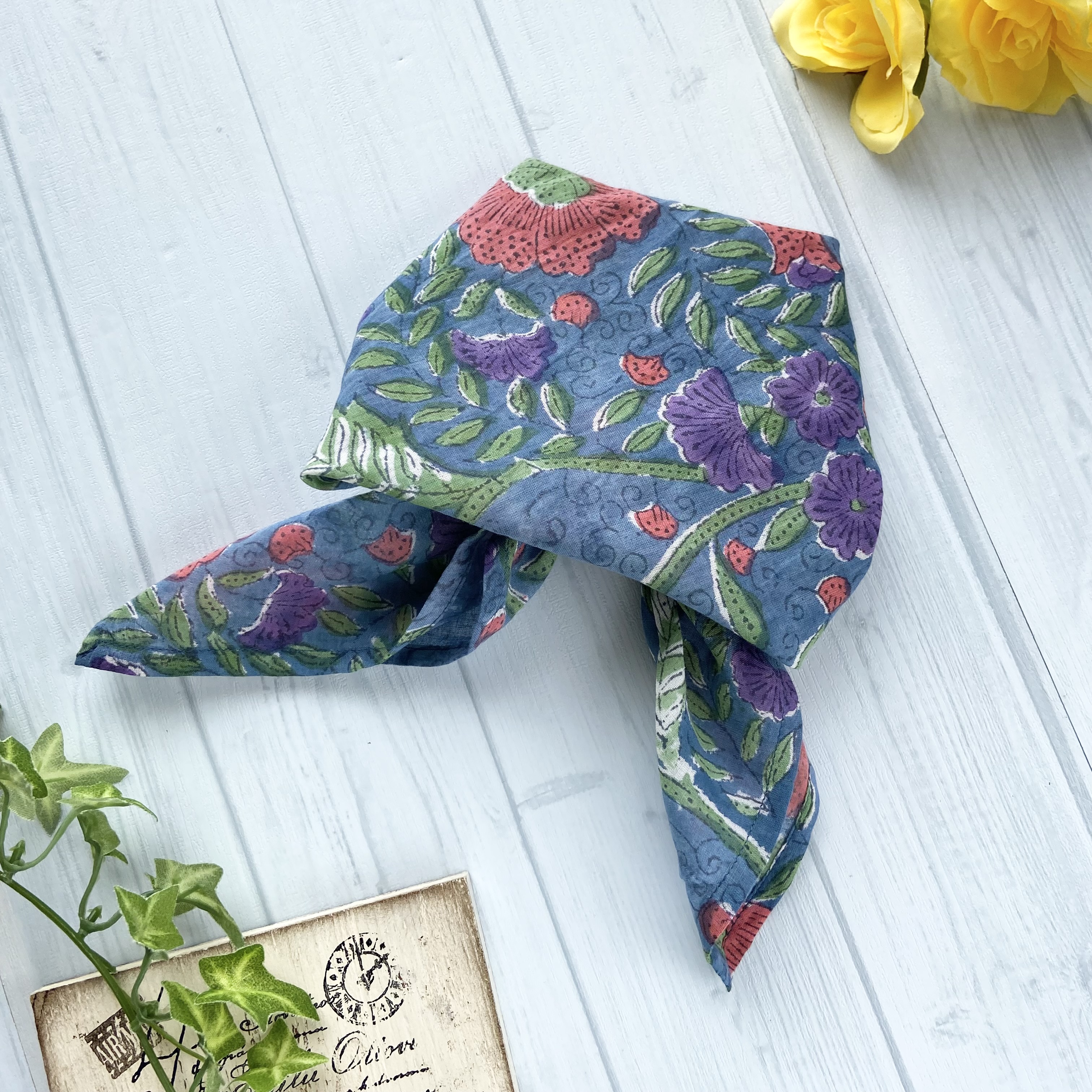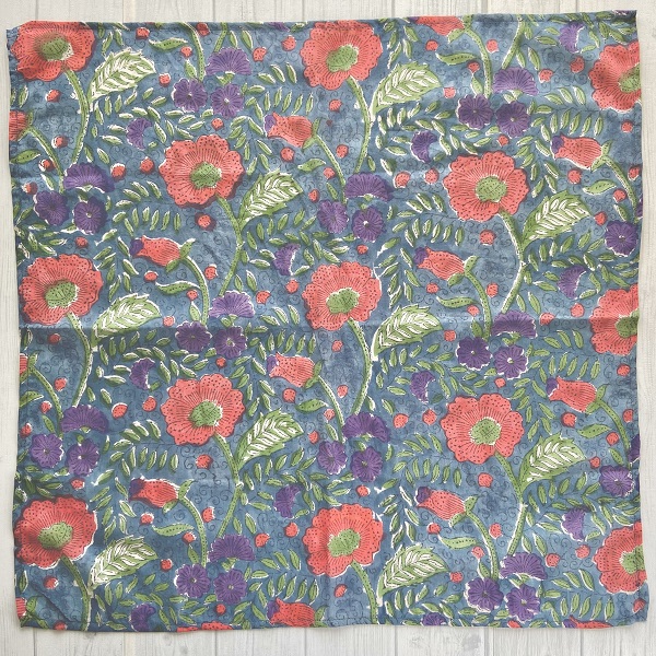 バンダナ インド綿100% レッド・パープル花柄 ブルー 52cm×52cm kb034