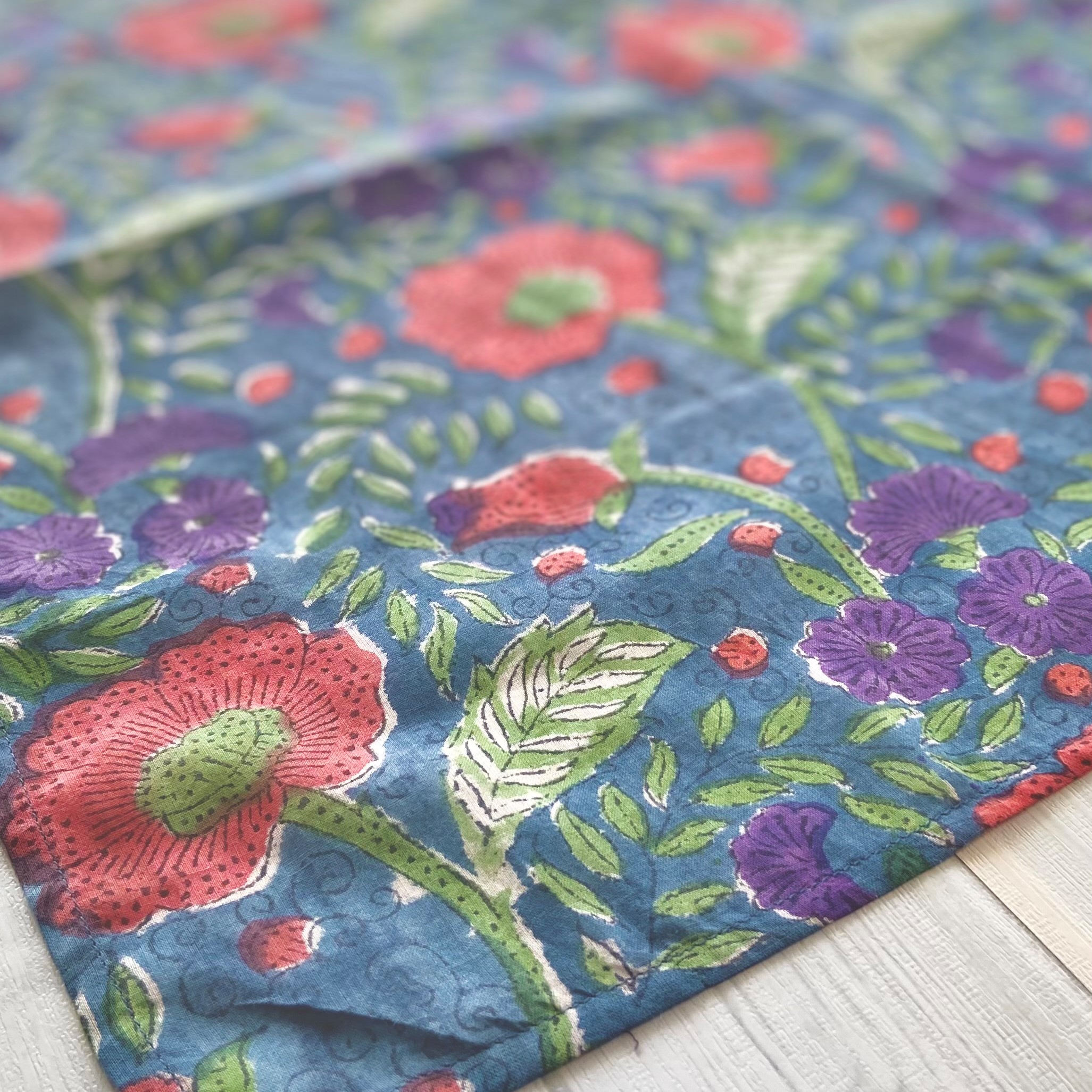 【バンダナ インド綿100% レッド・パープル花柄 ブルー 52cm×52cm kb034】