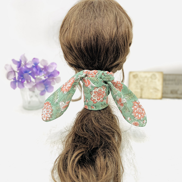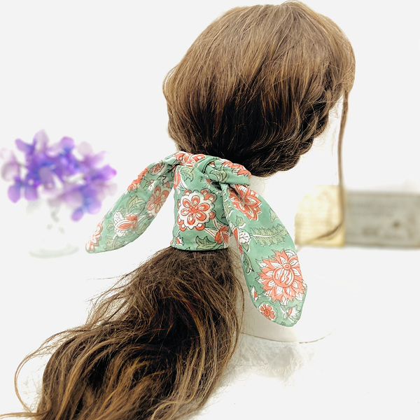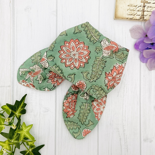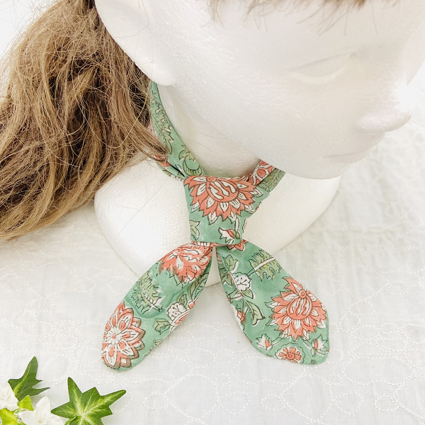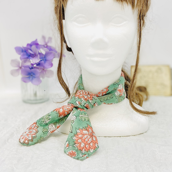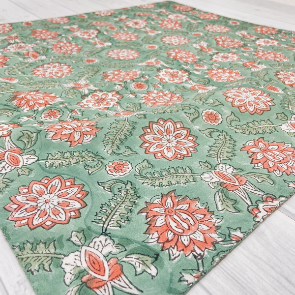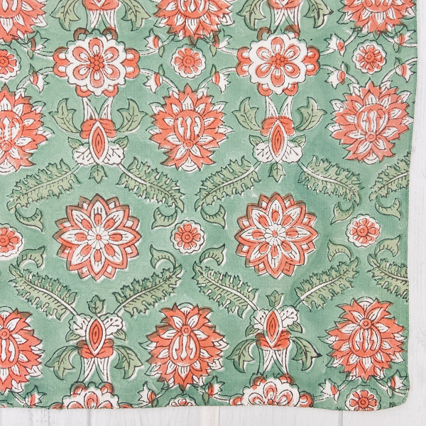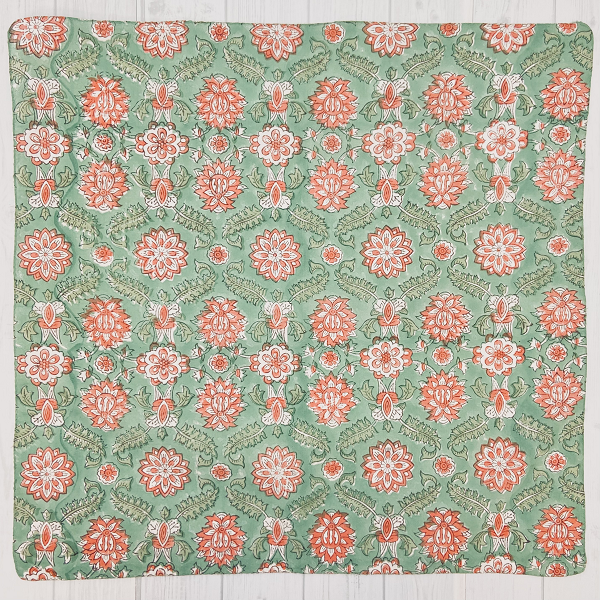 【バンダナ インド綿100% ブロックプリント ビッグフラワー 総柄 アジアン エスニック 北欧 カントリーグリーン オレンジ 約50cm×50cm kb054】