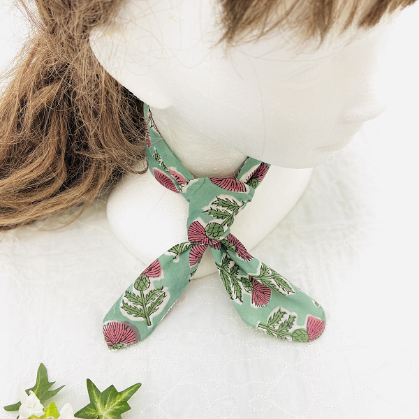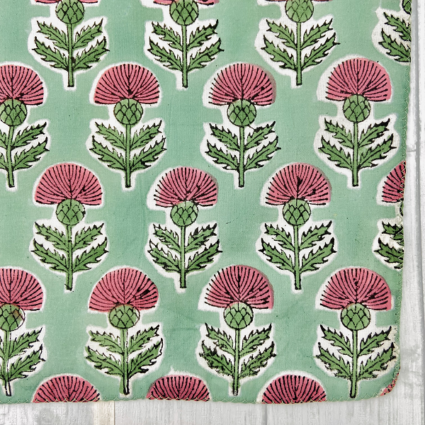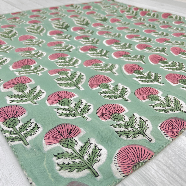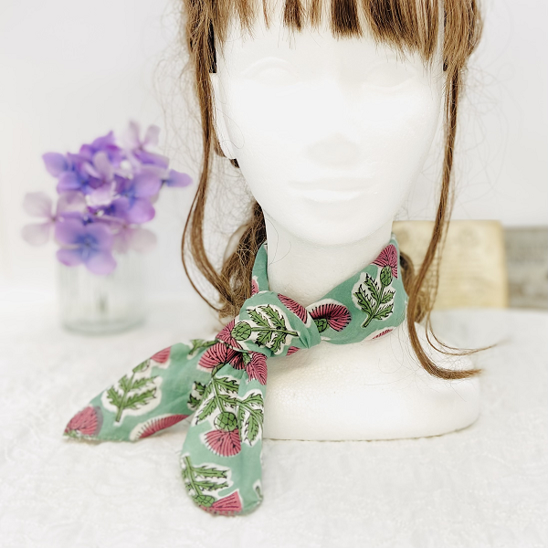 【バンダナ インド綿100% ブロックプリント アザミ 総柄 アジアン エスニック 北欧 カントリー グリーン ピンク 約50cm×50cm kb060】