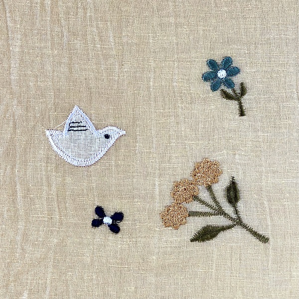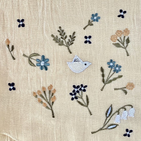 ストール 綿50% 麻50% 白い小鳥とフラワー ベージュ 160cm×30cm