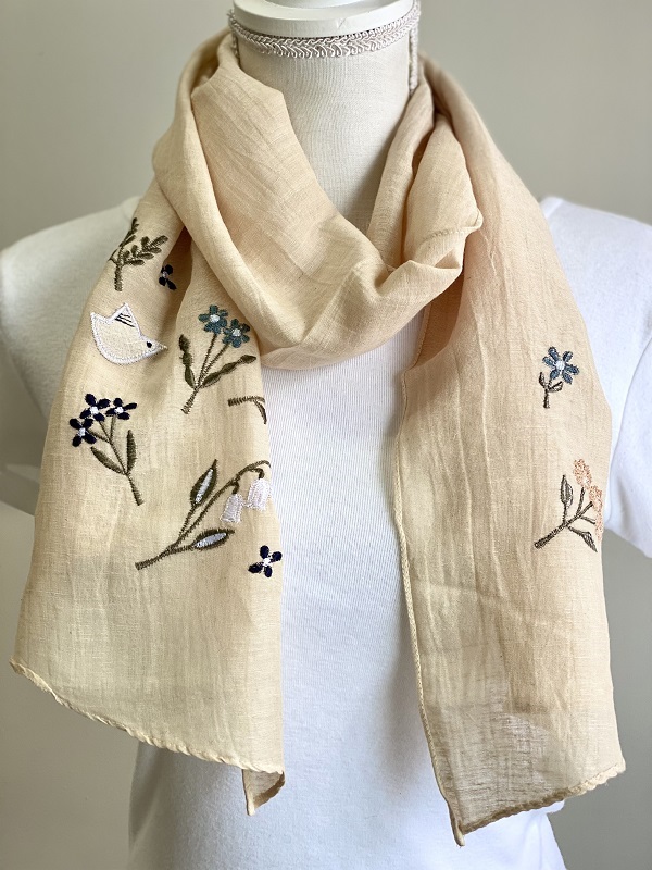 【*クスス雑貨・クスス雑貨 ストール 綿50% 麻50% 白い小鳥とフラワー 刺繍 北欧 カントリー ナチュラル 優しいカラーベージュ 160cm×30cm ks021】