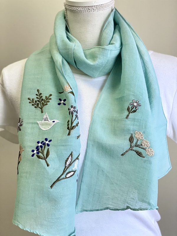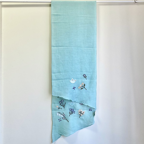 【*クスス雑貨・クスス雑貨 ストール 綿50% 麻50% 白い小鳥とフラワー 刺繍 北欧 カントリー ナチュラル 優しいカラーターコイズ 160cm×30cm ks022】