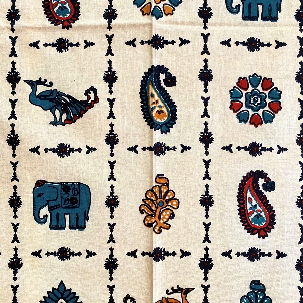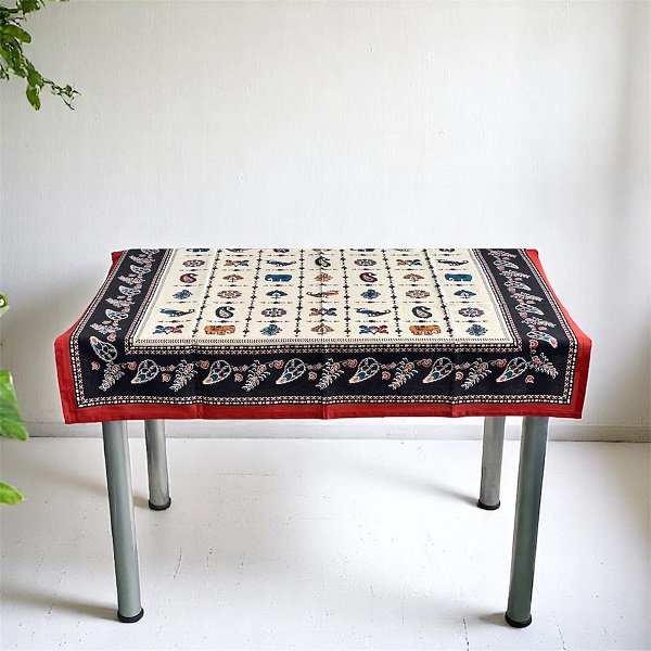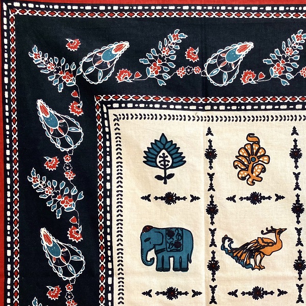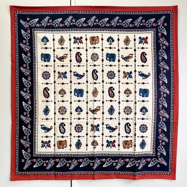 エキゾチックな象や孔雀、ペイズリー柄、植物模様をあしらったこのテーブルクロスは、インドの手仕事の魅力が詰まった一枚。温かみのある生成り色の生地に、赤・黒・アイボリーを基調とした豊かな色彩が映え、食卓を華やかに彩ります。