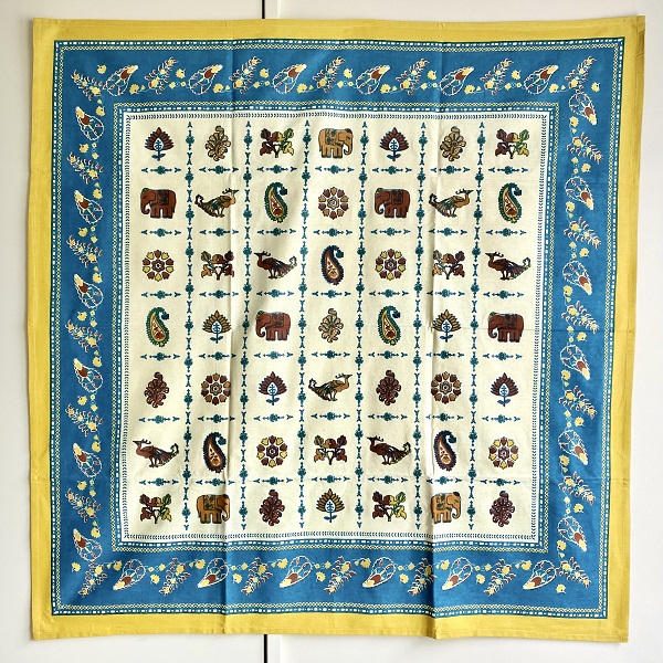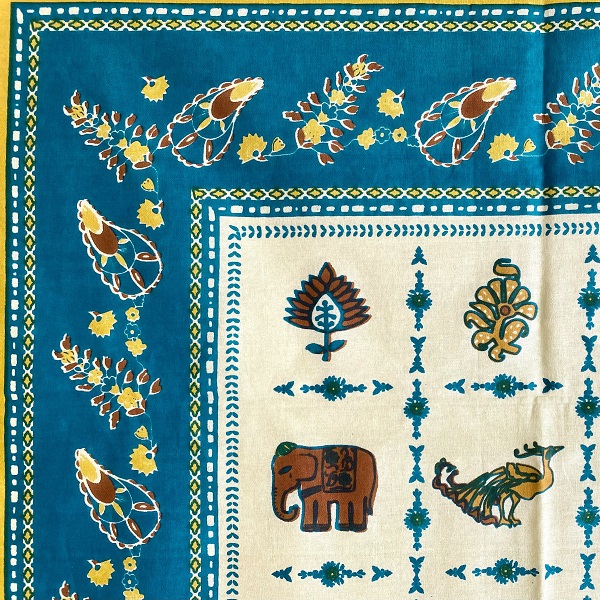 【テーブルクロス インド綿100% ブロックプリント 像 孔雀 ペイズリー柄 エスニック エレガント アジアン ターコイズ 目隠し 正方形 105cm×105cm kc009】