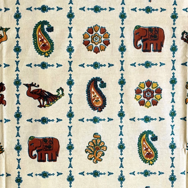 エキゾチックな象や孔雀、ペイズリー柄、植物模様をあしらったこのテーブルクロスは、インドの手仕事の魅力が詰まった一枚。温かみのある生成り色の生地に、赤・黒・アイボリーを基調とした豊かな色彩が映え、食卓を華やかに彩ります。