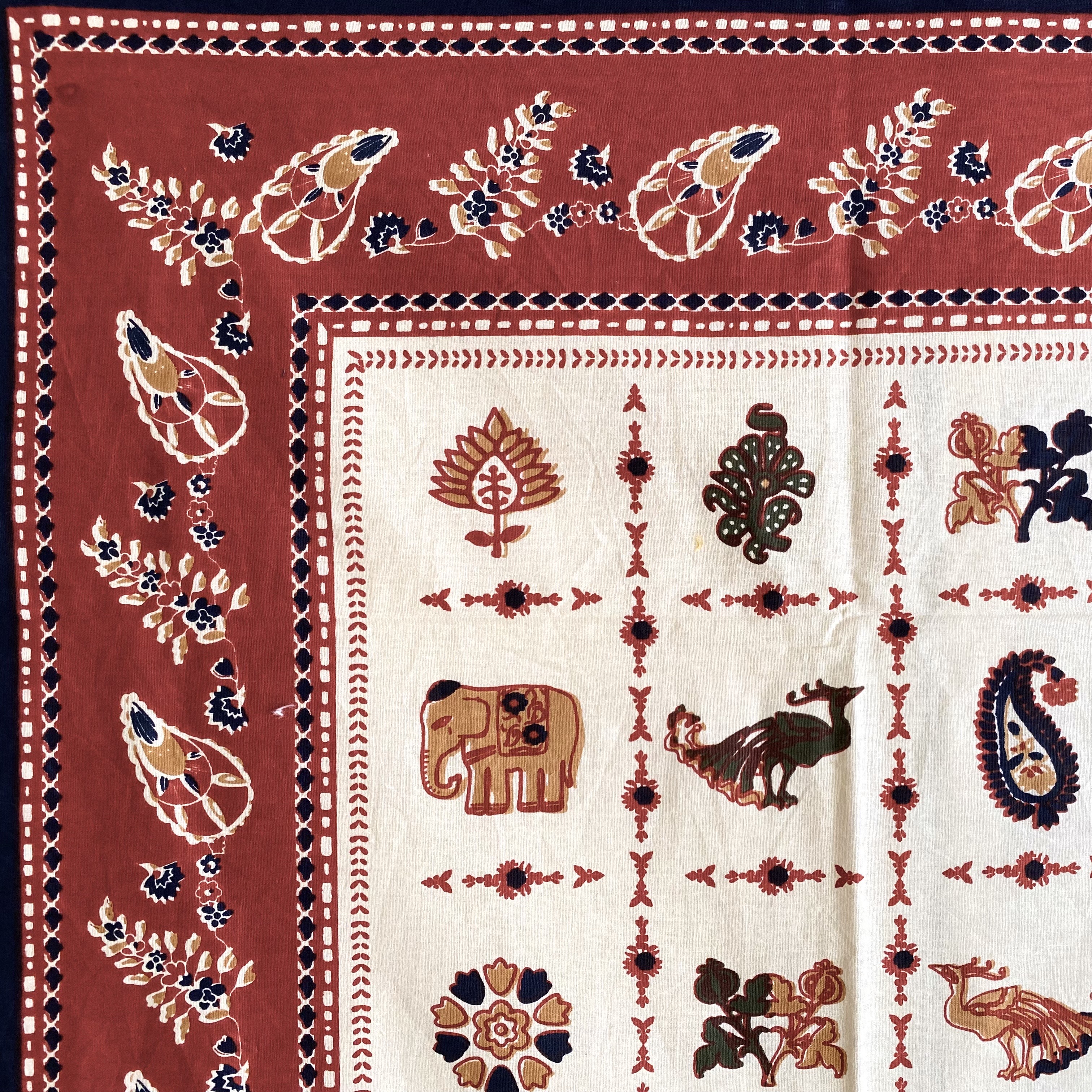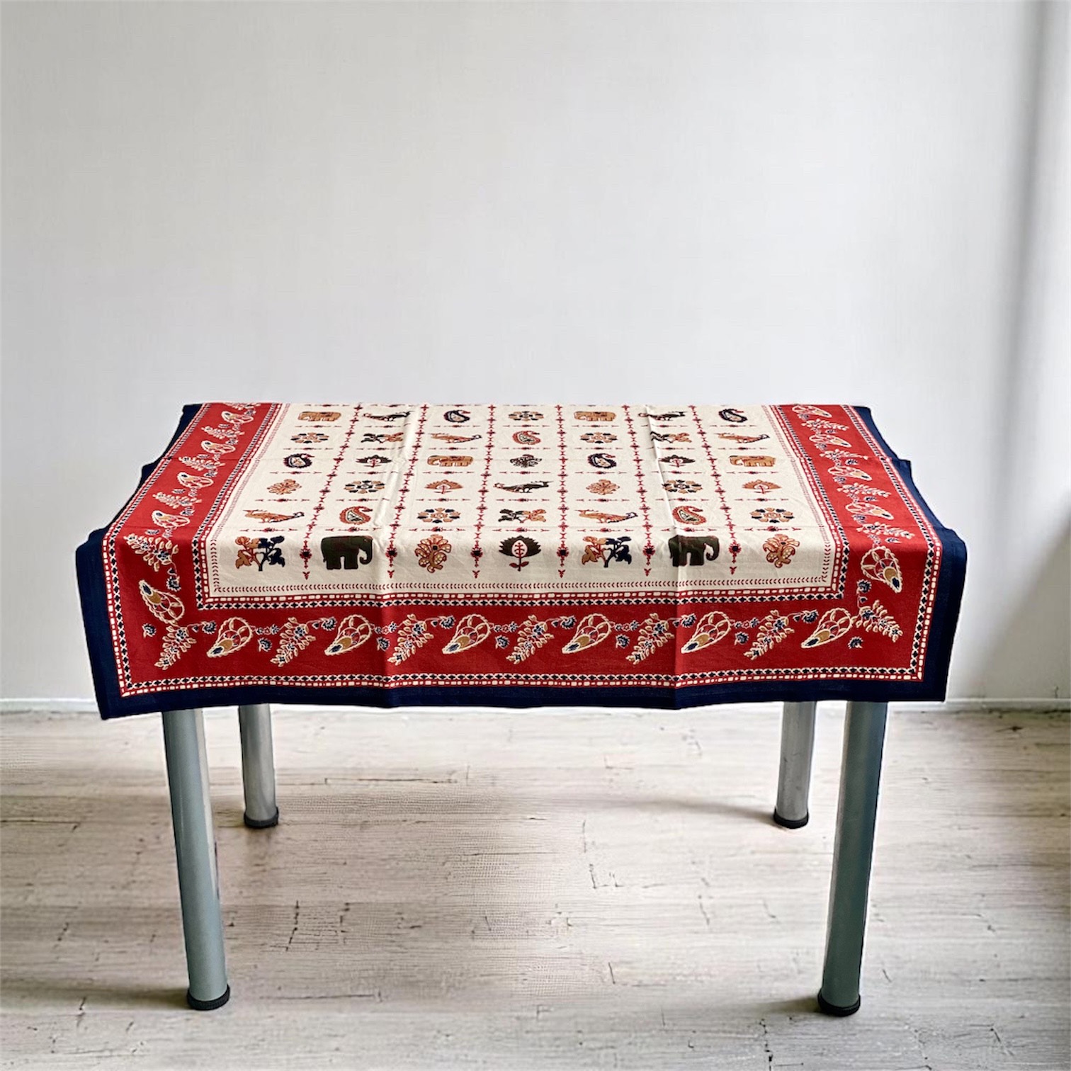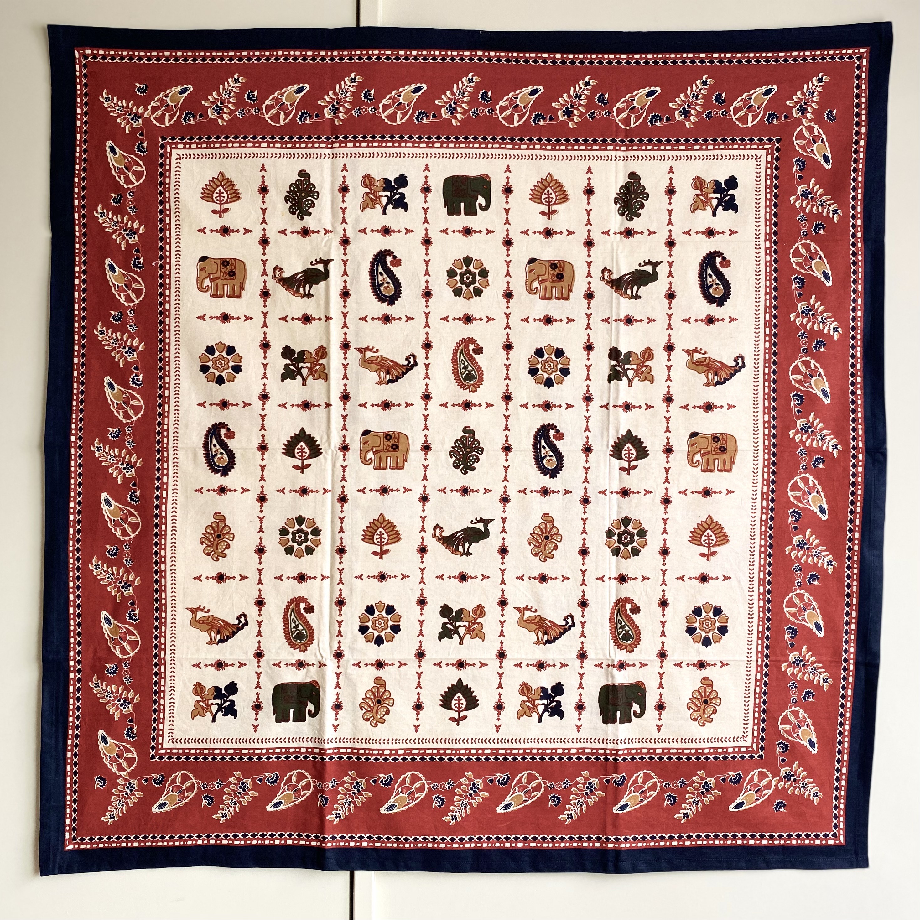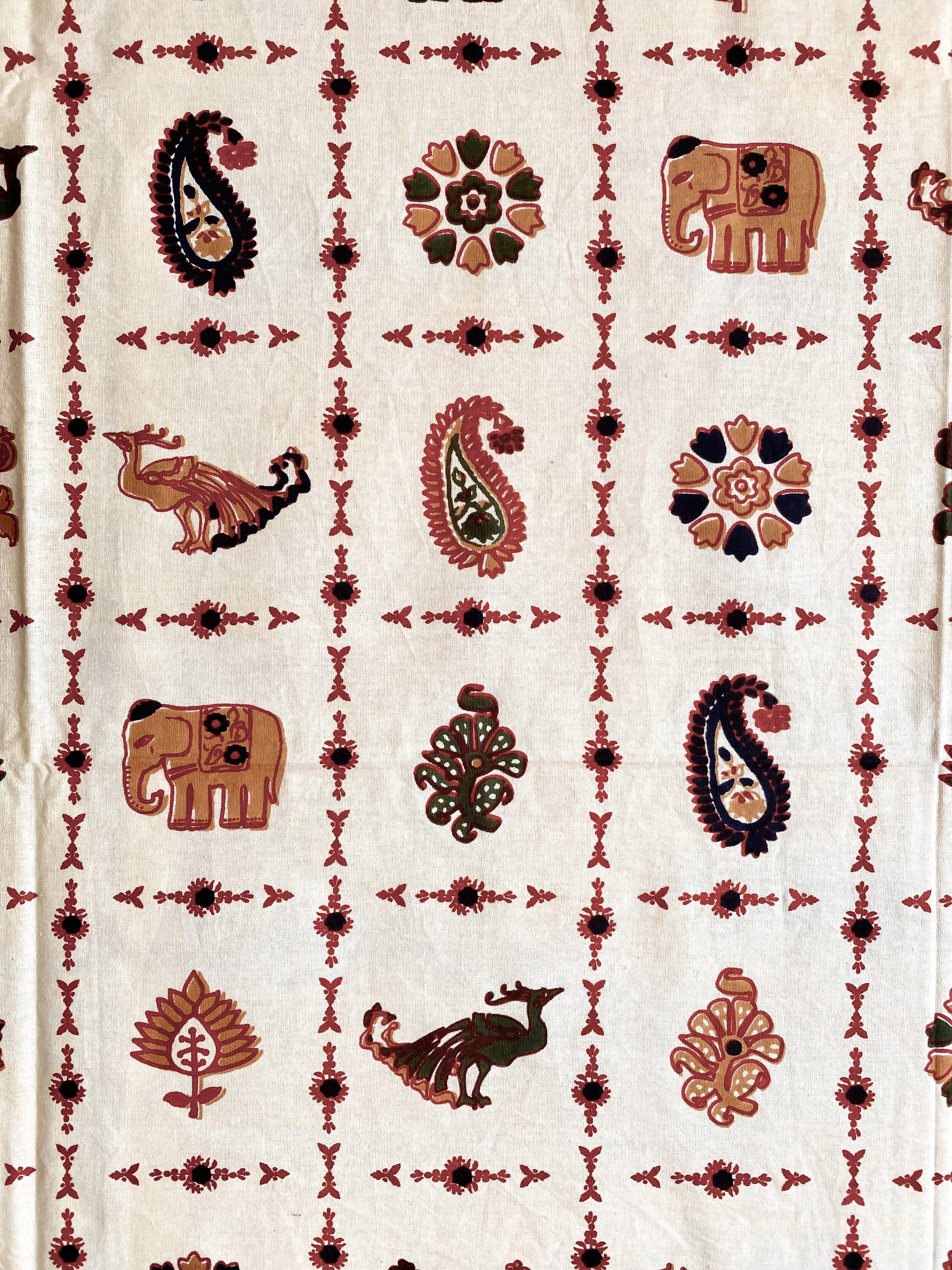 エキゾチックな象や孔雀、ペイズリー柄、植物模様をあしらったこのテーブルクロスは、インドの手仕事の魅力が詰まった一枚。温かみのある生成り色の生地に、赤・黒・アイボリーを基調とした豊かな色彩が映え、食卓を華やかに彩ります。