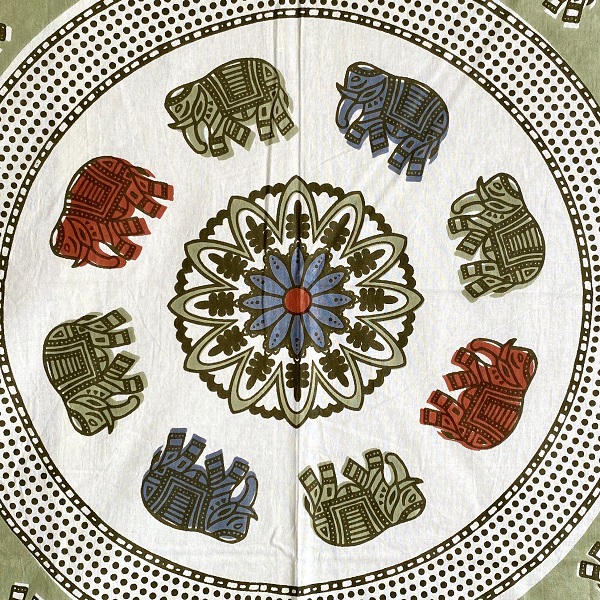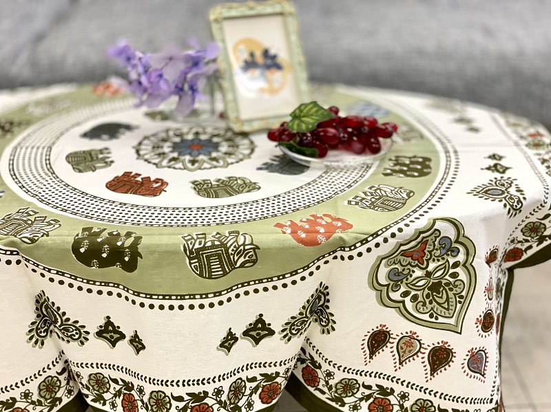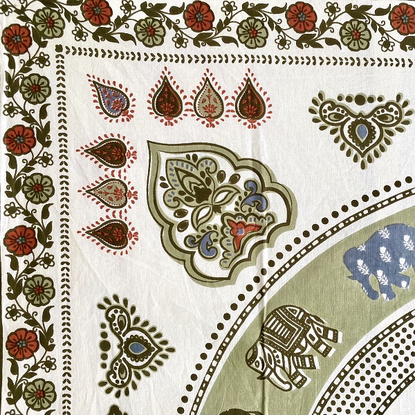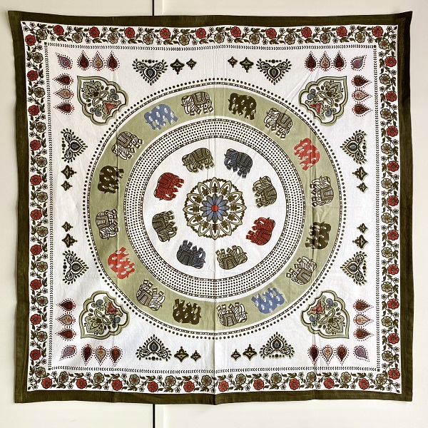 エキゾチックな象、ペイズリー柄がモチーフとなったインパクトのがあるアジアンテイストなテーブルクロスです。インドの手仕事の魅力が詰まった一枚。温かみのある生成り色の生地にグリーン・レッド・カーキー・ホワイトを基調とした豊かな色彩が映え、食卓を華やかに彩ります。