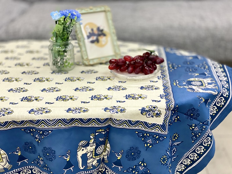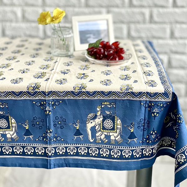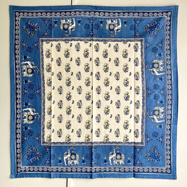 テーブルクロス インド綿100% 像の行進 ブルー 105cm×105cm