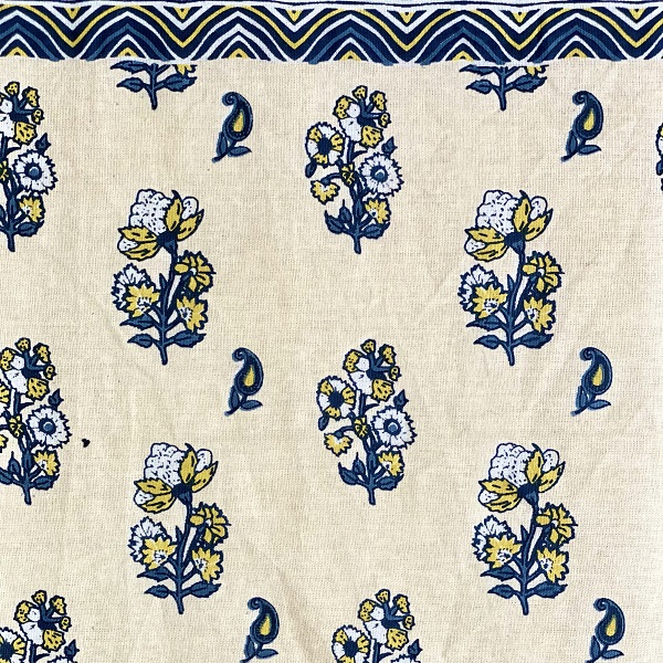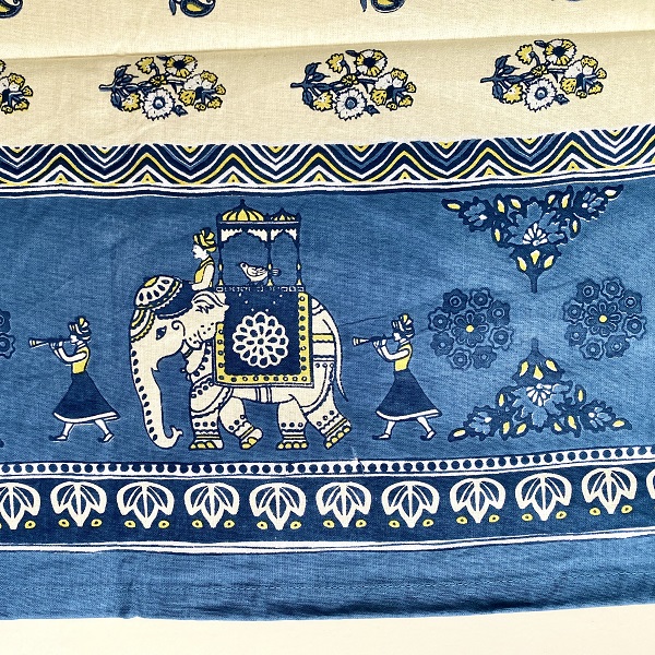 エキゾチックな象柄、ペイズリー柄がモチーフとなったインパクトのがあるアジアンテイストなテーブルクロスです。インドの手仕事の魅力が詰まった一枚。温かみのある生成り色の生地に水色・ネイビー・ブルー・ホワイトを基調とした豊かな色彩が映え、食卓を華やかに彩ります。