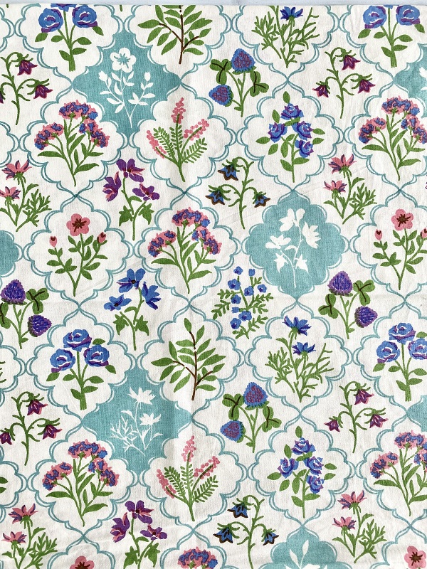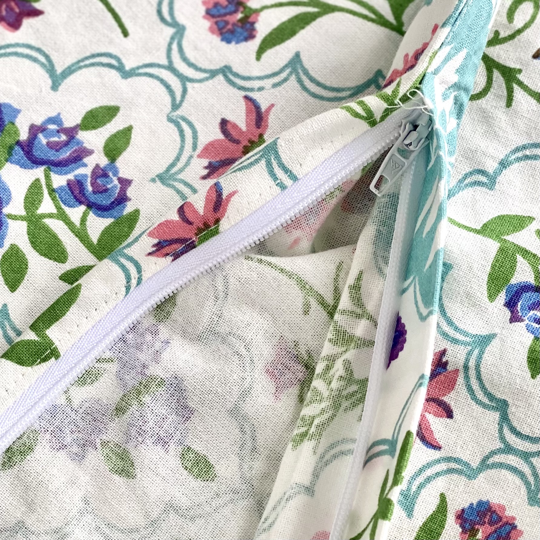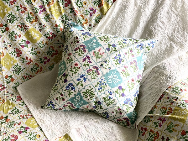 【*クスス雑貨 クッション カバー アンティークレース ボタニカルフラワーブロックプリント インド綿 エレガント ヨーロッパ 北欧 華やか コットン100% ブルー 青 kh017】