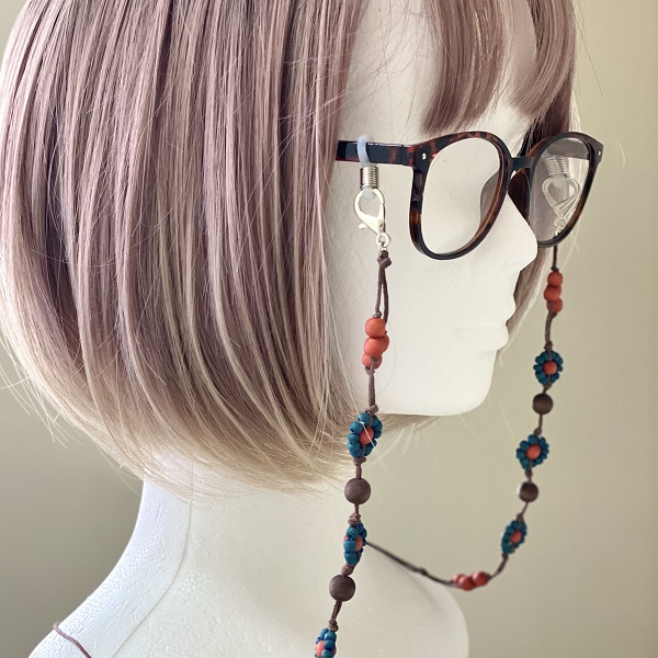 メガネチェーン ビーズ 花がら オレンジ ブルー 70cm