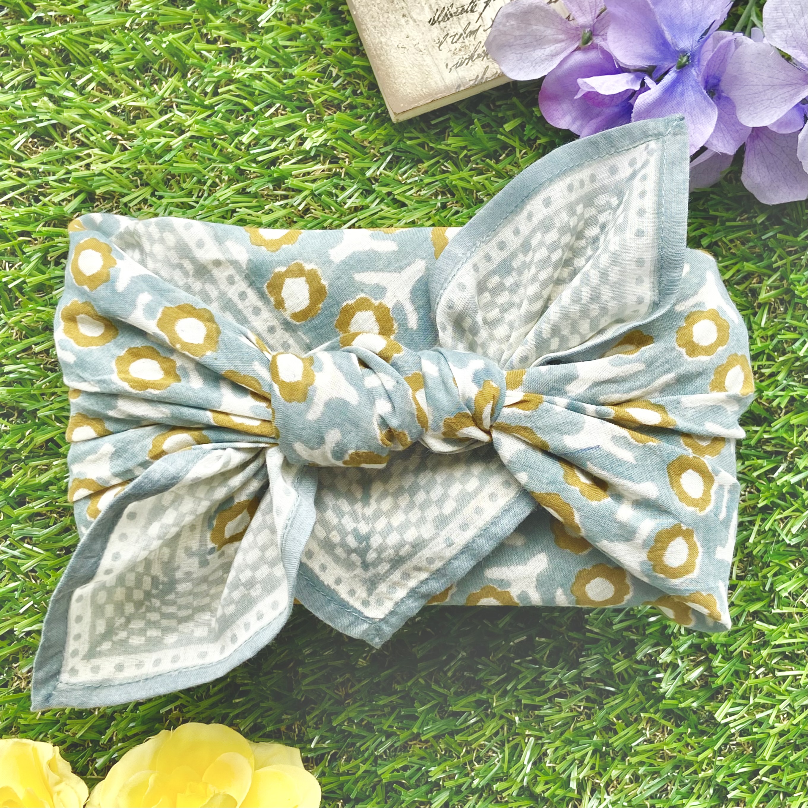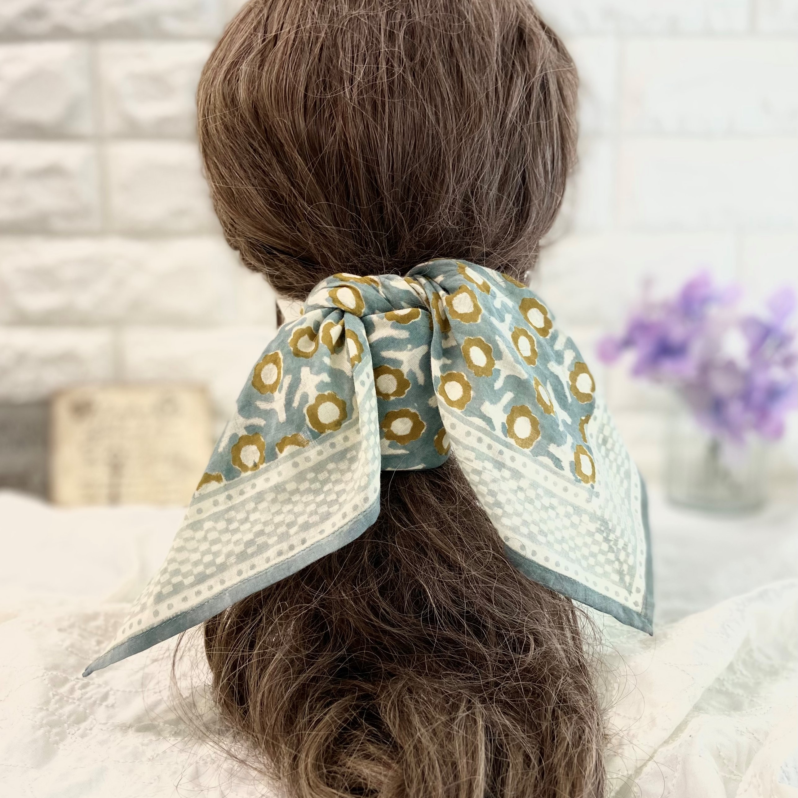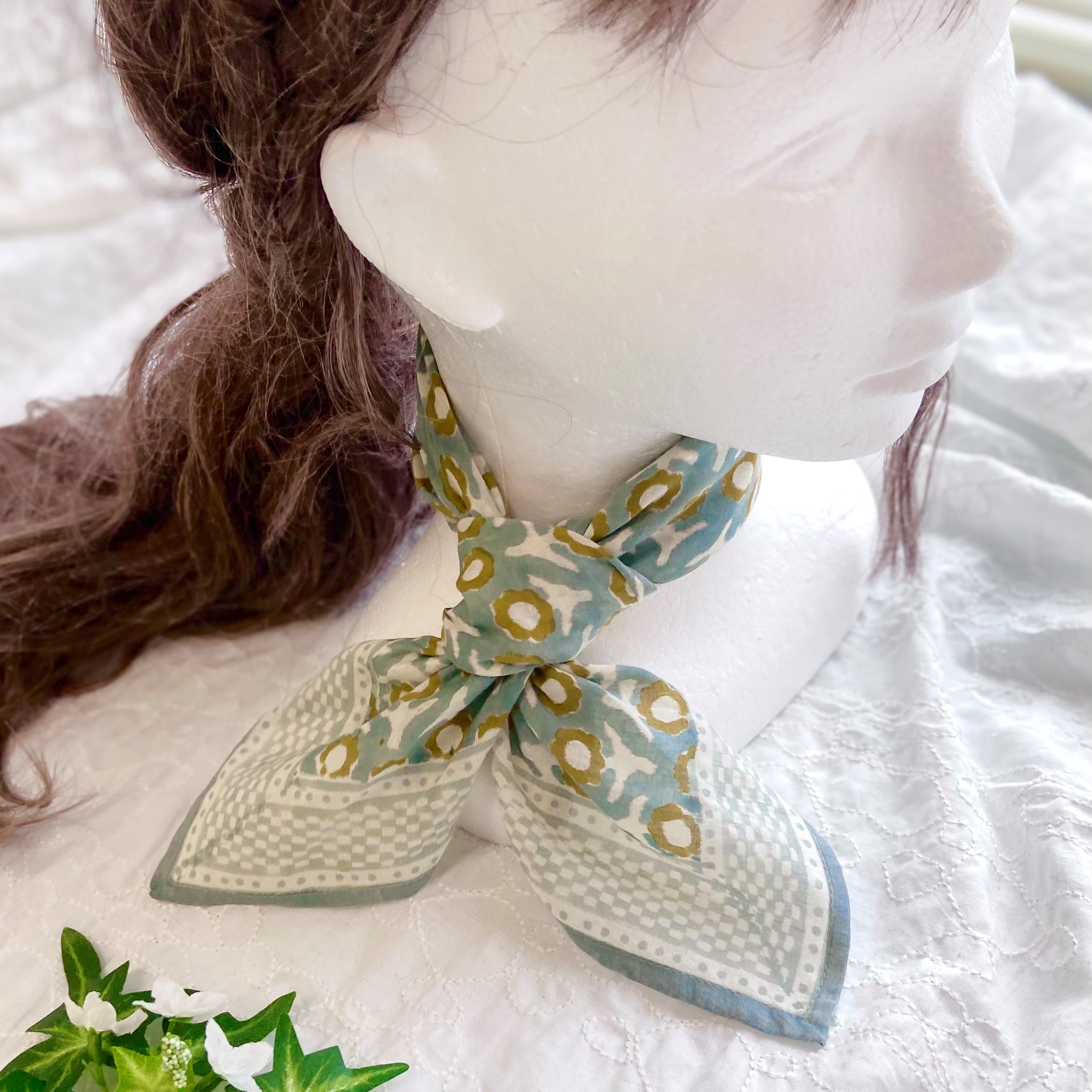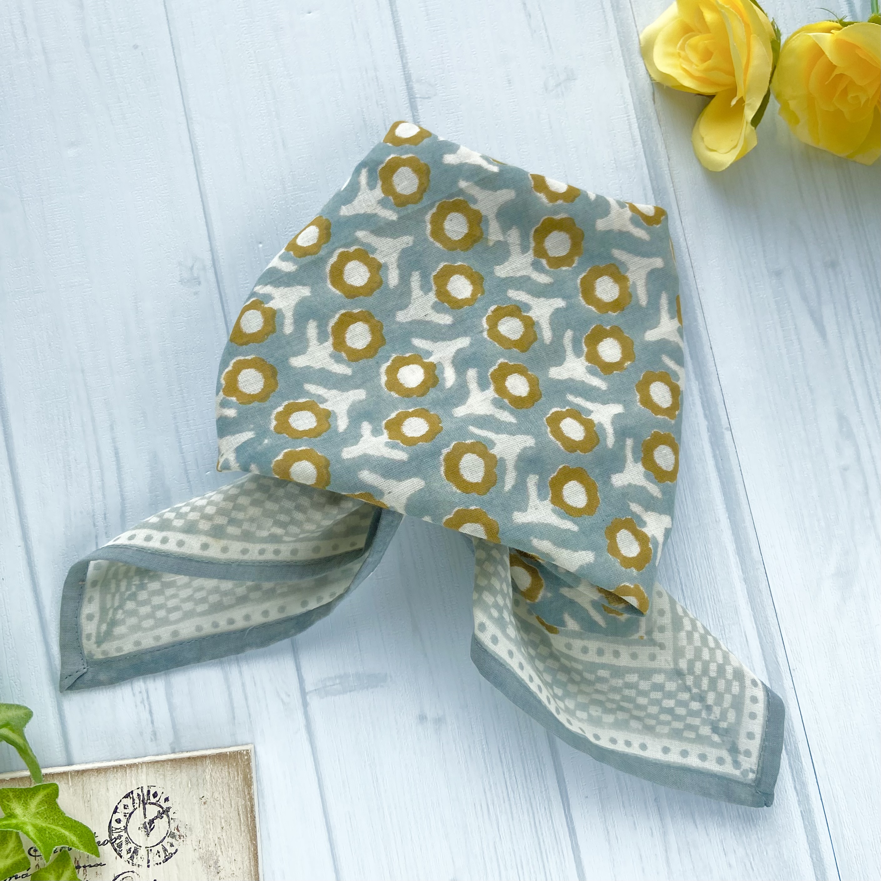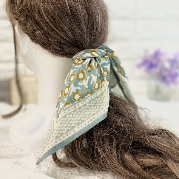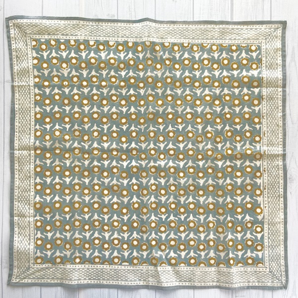 柔らかなコットン素材に、落ち着いたクーリッシュブルーの色合いが大人可愛いバンダナです。シンプルながらに味のある1枚となっており、お部屋のアクセントやお弁当包み、スカーフ、ヘアアクセサリーなどにもぴったり
