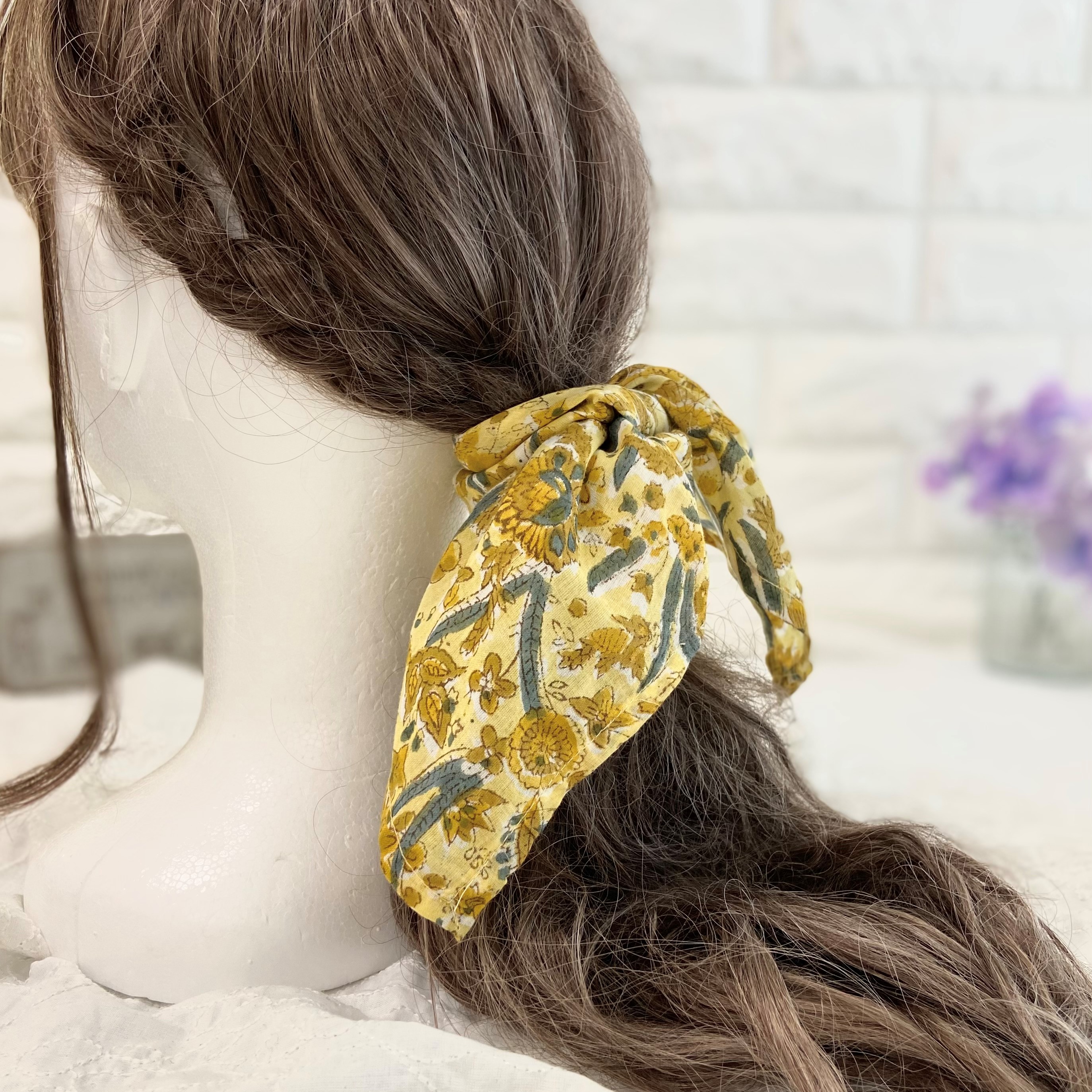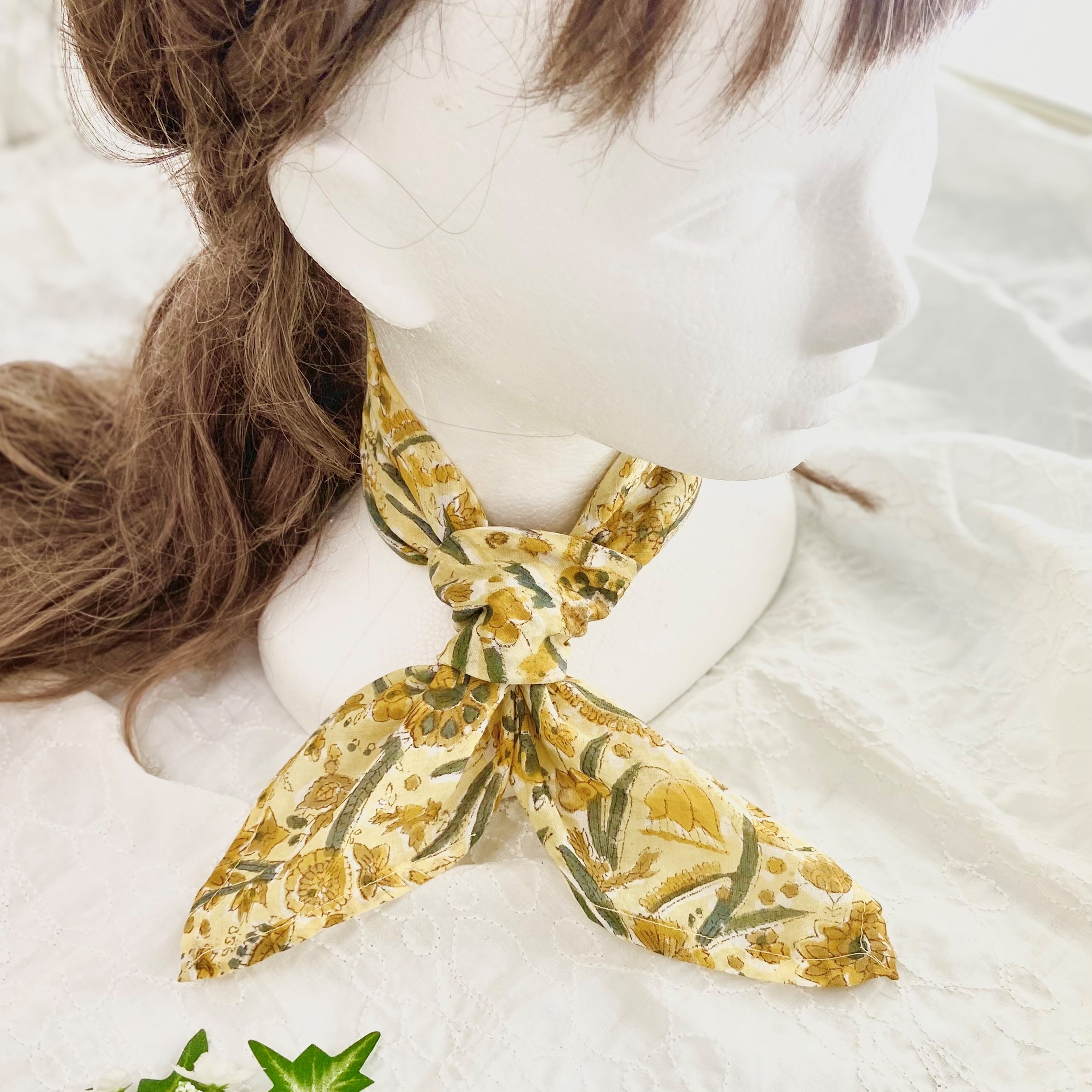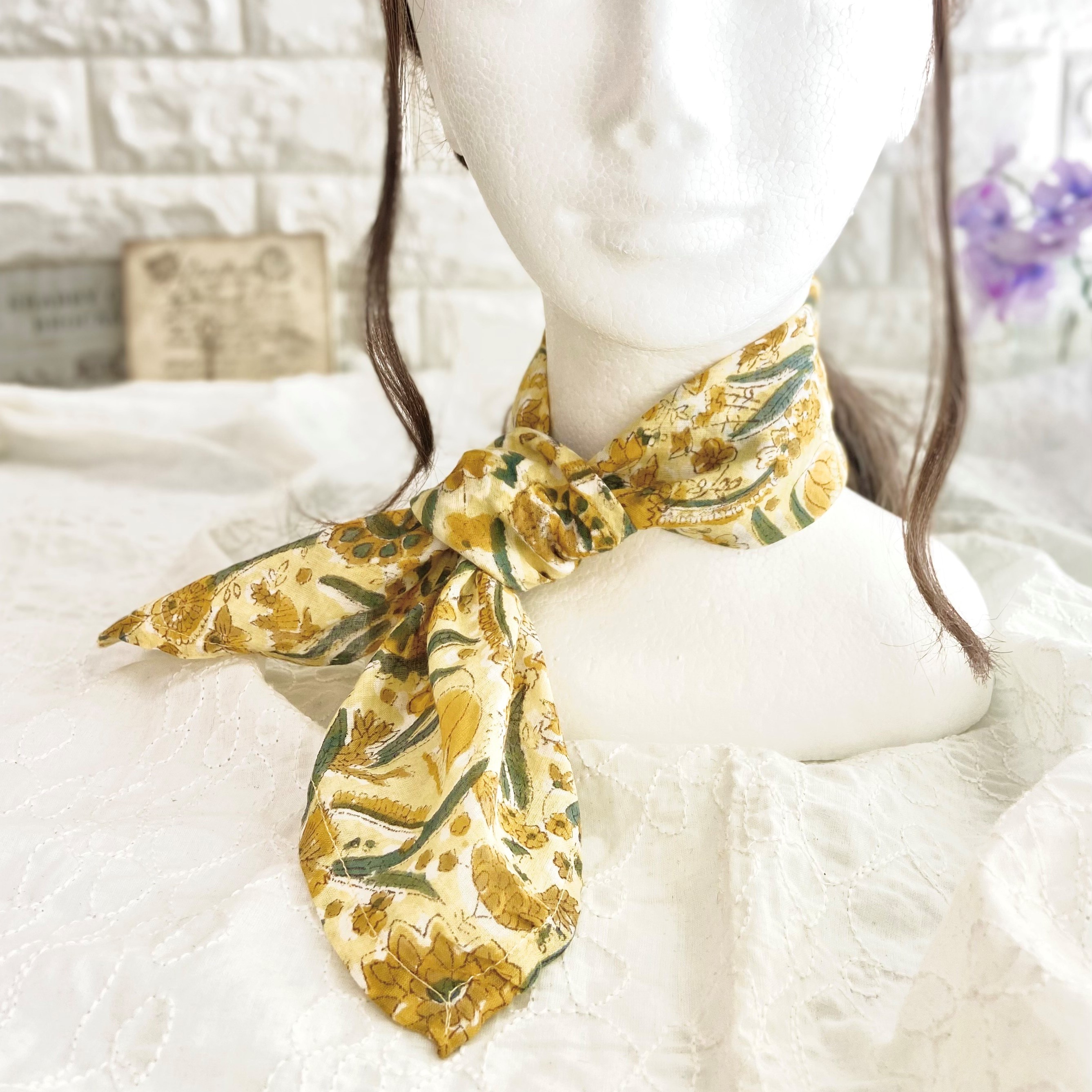 柔らかなコットン素材に、落ち着いた花柄が印象的なバンダナです。品のあるイエローの花柄が持っているだけで気持ちを明るくしてくれます♪お部屋のアクセントやお弁当包み、スカーフ、ヘアアクセサリーなどにもぴったり