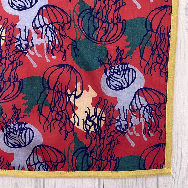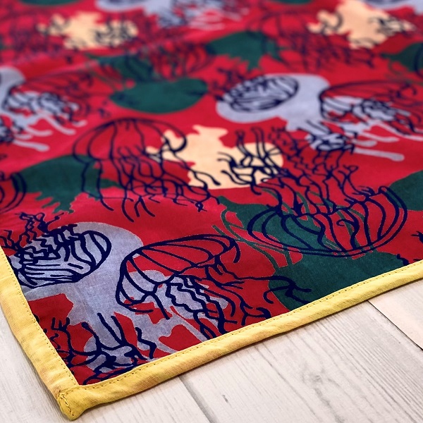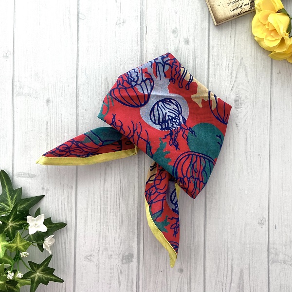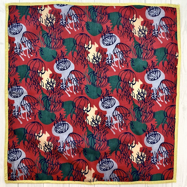 柔らかなコットン素材に、インパクトのあるくらげの総柄モチーフです。発色の良い縁取りのイエローがるアクセントとなり首に巻いたり、ヘアアクセントに使用したりすると差し色となります♪♪お部屋のアクセントやお弁当包み、スカーフ、ヘアアクセサリーなどにもぴったり