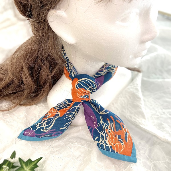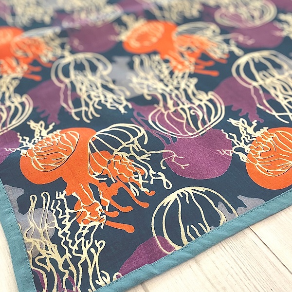 柔らかなコットン素材に、インパクトのあるくらげの総柄モチーフです。発色の良い縁取りの水色がるアクセントとなり首に巻いたり、ヘアアクセントに使用したりすると差し色となります♪♪お部屋のアクセントやお弁当包み、スカーフ、ヘアアクセサリーなどにもぴったり