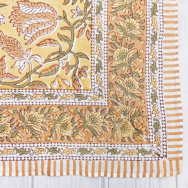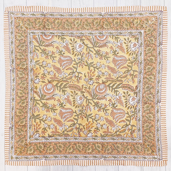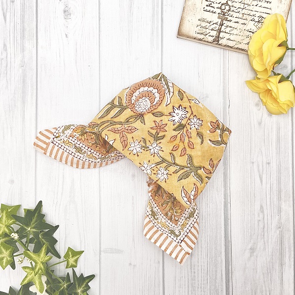 【バンダナ 大判 カリーノ ブロックプリント インド綿100% サフランイエロー アジアン エスニック 北欧 お弁当 包み スカーフ スタイ レディース 約52cm×52cm】