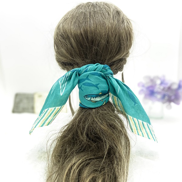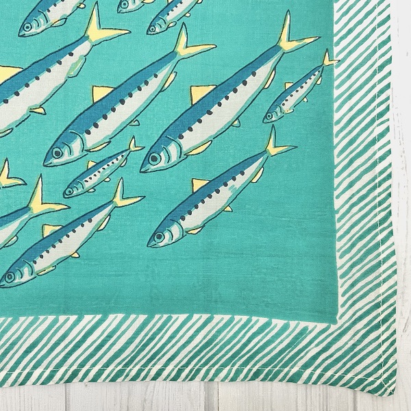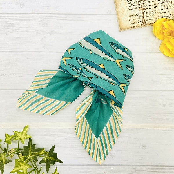 【バンダナ 大判 いわし 魚 アニマル 珍しい ブロックプリント インド綿100% グリーン 和 アジアン お弁当 包み スカーフ スタイ 約53cm×53cm kb045】