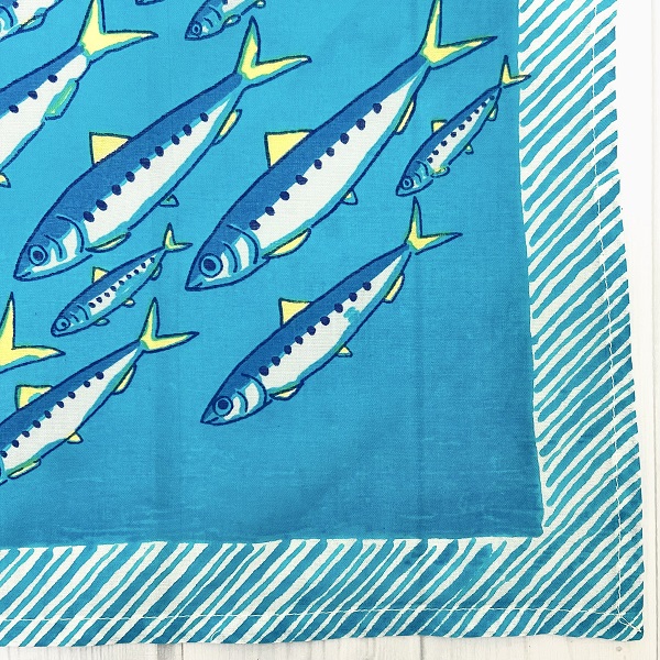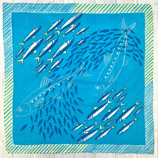 【バンダナ 大判 いわし 魚 アニマル 珍しい ブロックプリント インド綿100% ブルー 和 アジアン お弁当 包み スカーフ スタイ 約53cm×53cm kb047】