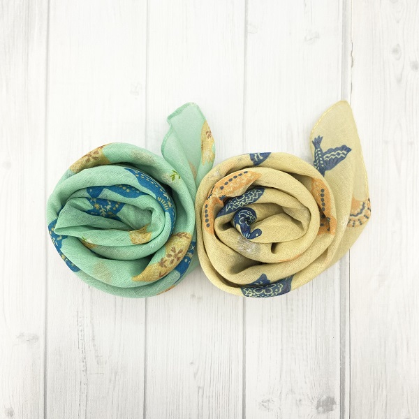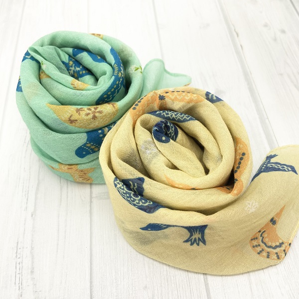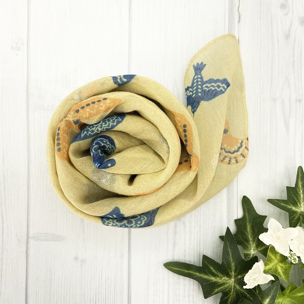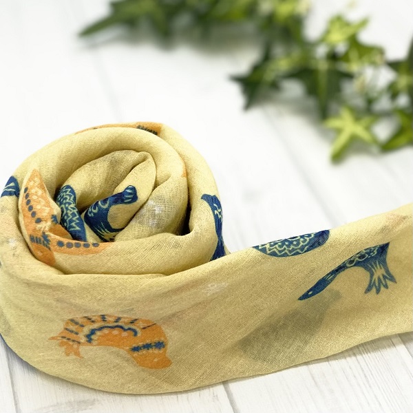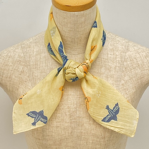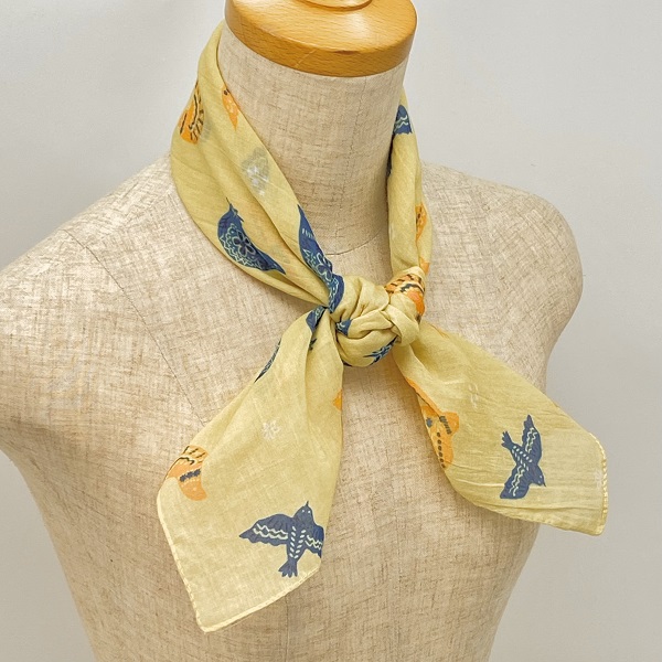 スカーフ 綿100% バードブリント イエロー 70cm×70cm