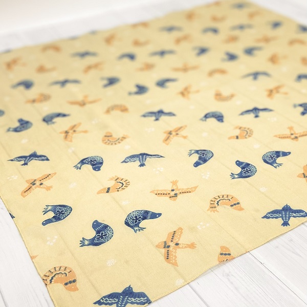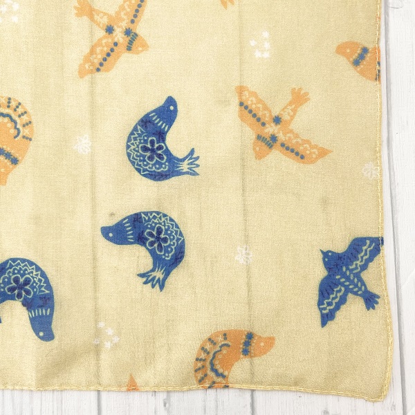 【クスス雑貨 スカーフ 綿100% バードブリント 北欧 カントリー ナチュラル プリント イエロー 70cm×70cm KS024】