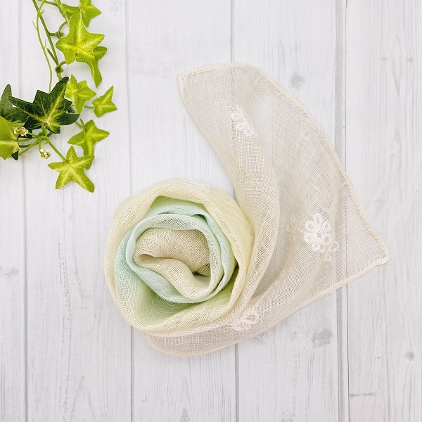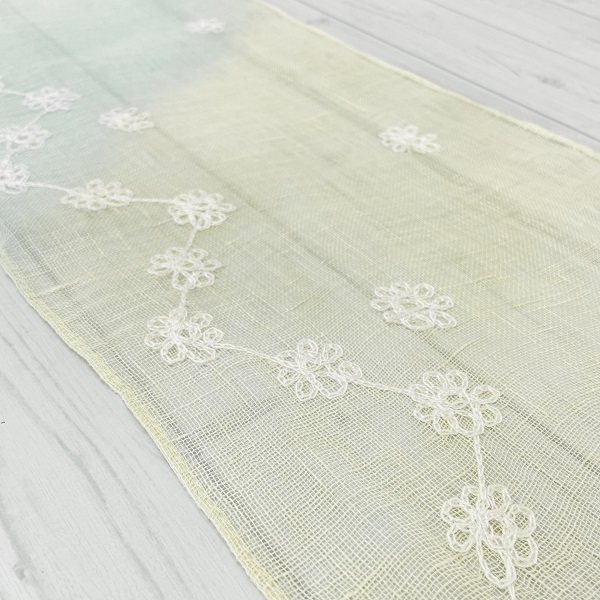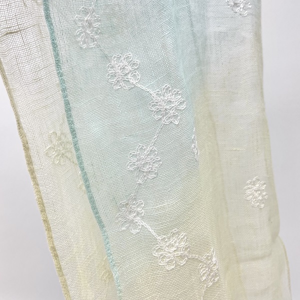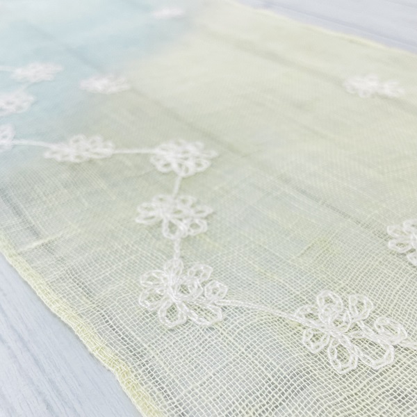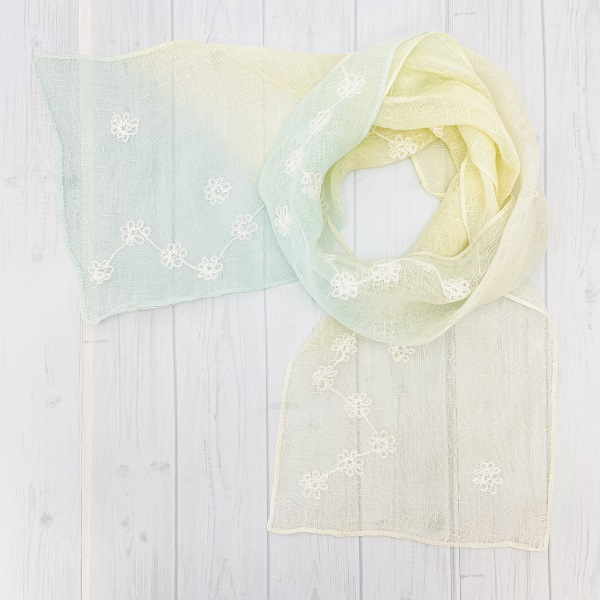【クスス雑貨 クスス雑貨 クスス雑貨 スカーフ 麻100% グラデーションカラー フラワー刺繍 幅小さめ コンパクトサイズ 北欧 カントリー ナチュラル ブルー 140cm×22cm】