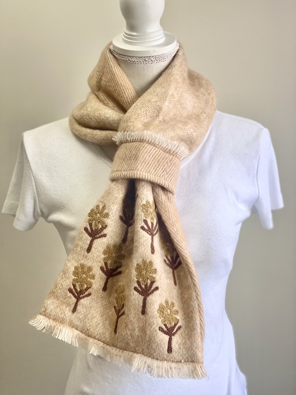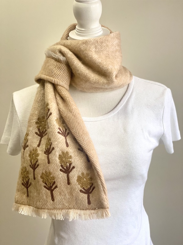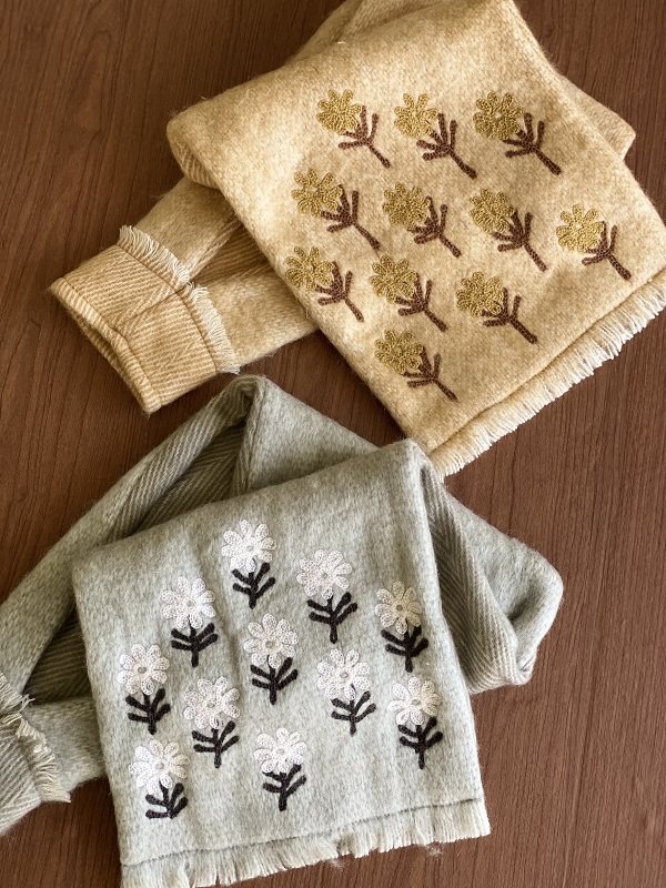 【クスス雑貨 マフラー ネックウォーマー アリ刺繍 フラワー ベージュ 着用しやすい 北欧 シンプル カントリー アクリル100% 22cm×90cm ks037】