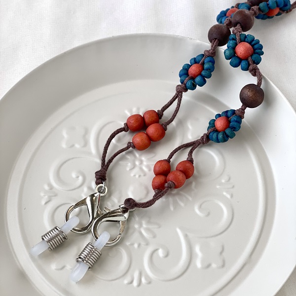 メガネチェーン ビーズ ウッドボール 花がら オレンジ ブルー 約70cm kh021