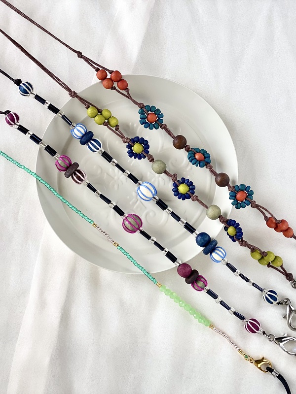 【*クスス雑貨・"メガネチェーン おしゃれ かわいい ビーズ ウッドボール レディース 花がら 黄緑 ブルー めがね 眼鏡チェーン 北欧 アジアン ギフト】