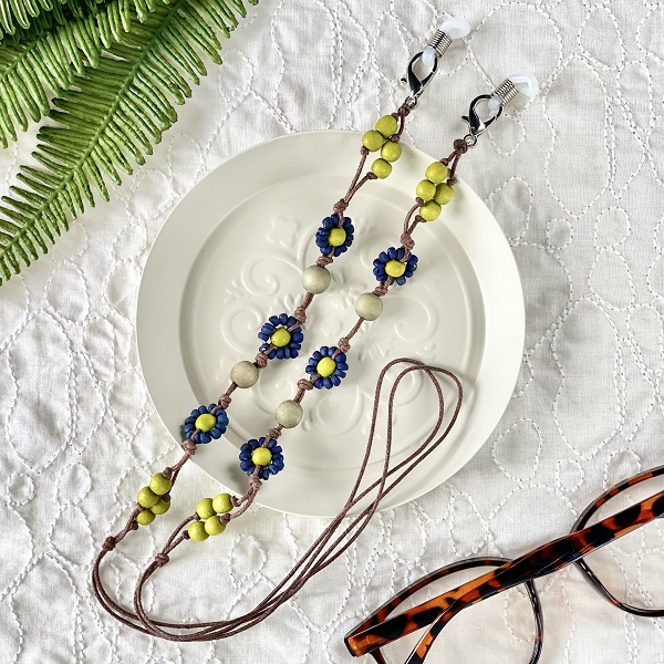 メガネチェーン ビーズ ウッドボール 花がら 黄緑 ブルー 約70cm kh022