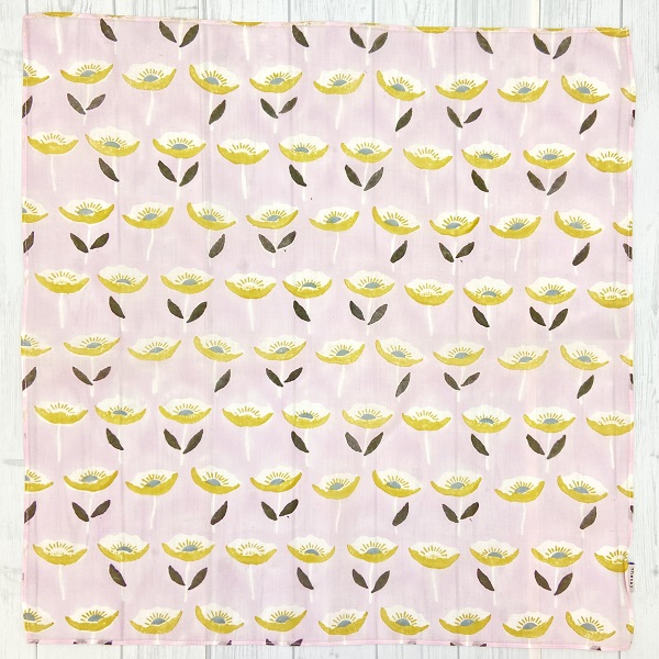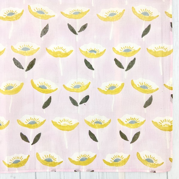 冬に色鮮やかに花開くアネモネをモチーフにしたブロックプリントハンカチ。ギリシャ語で「風」を意味するアネモスを由来に持ち、イギリスでは「wind flower」と呼ばれるこの花が、風に揺れながら咲く美しい姿をデザインに落とし込みました。「希望」や「期待」といった花言葉を持つアネモネは、贈り物としても最適。