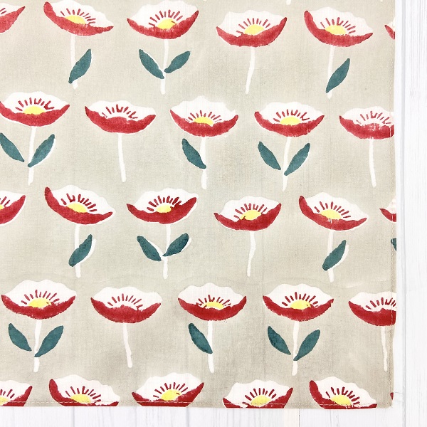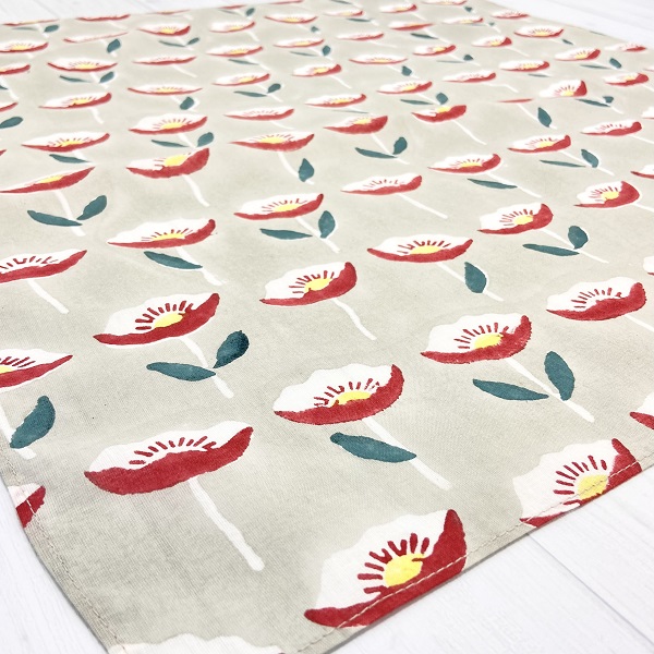 冬に色鮮やかに花開くアネモネをモチーフにしたブロックプリントハンカチ。ギリシャ語で「風」を意味するアネモスを由来に持ち、イギリスでは「wind flower」と呼ばれるこの花が、風に揺れながら咲く美しい姿をデザインに落とし込みました。「希望」や「期待」といった花言葉を持つアネモネは、贈り物としても最適。