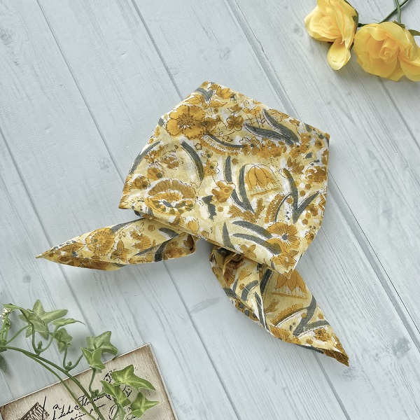 柔らかなコットン素材に、落ち着いた花柄が印象的なバンダナです。品のあるイエローの花柄が持っているだけで気持ちを明るくしてくれます♪お部屋のアクセントやお弁当包み、スカーフ、ヘアアクセサリーなどにもぴったり