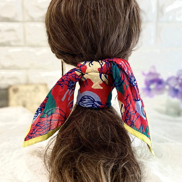 柔らかなコットン素材に、インパクトのあるくらげの総柄モチーフです。発色の良い縁取りのイエローがるアクセントとなり首に巻いたり、ヘアアクセントに使用したりすると差し色となります♪♪お部屋のアクセントやお弁当包み、スカーフ、ヘアアクセサリーなどにもぴったり
