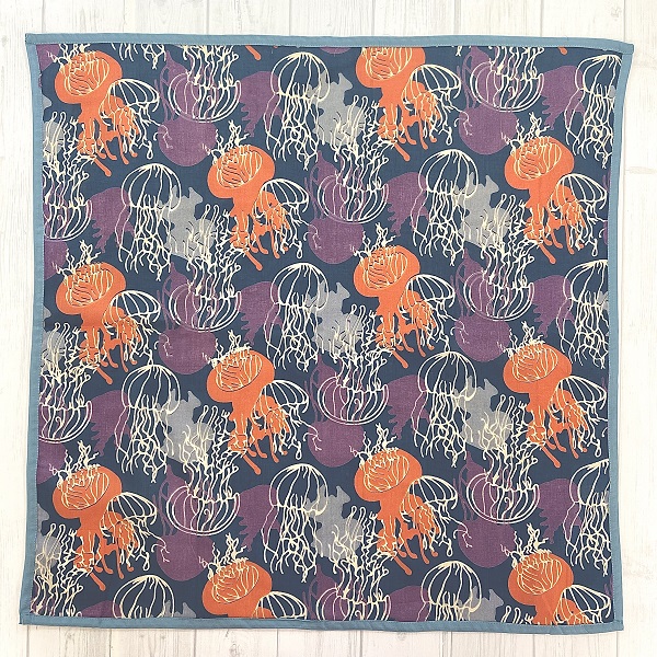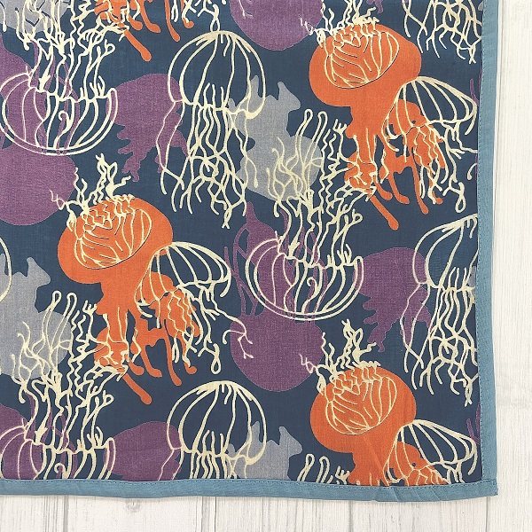 柔らかなコットン素材に、インパクトのあるくらげの総柄モチーフです。発色の良い縁取りの水色がるアクセントとなり首に巻いたり、ヘアアクセントに使用したりすると差し色となります♪♪お部屋のアクセントやお弁当包み、スカーフ、ヘアアクセサリーなどにもぴったり