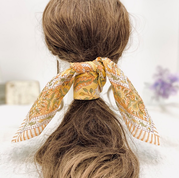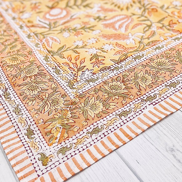 【バンダナ 大判 カリーノ ブロックプリント インド綿100% サフランイエロー アジアン エスニック 北欧 お弁当 包み スカーフ スタイ レディース 約52cm×52cm】