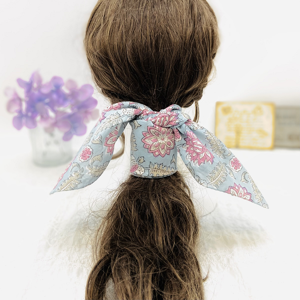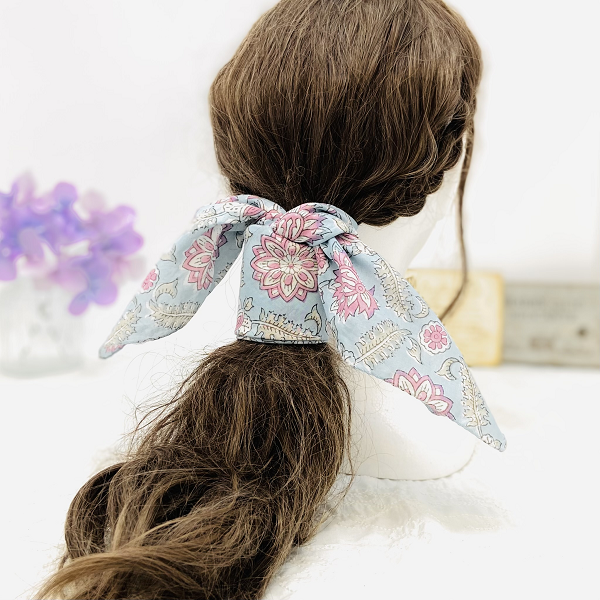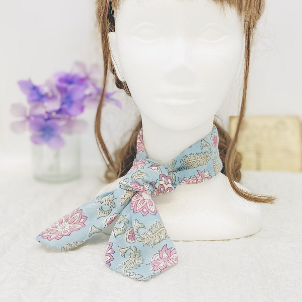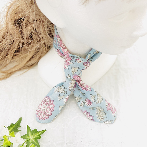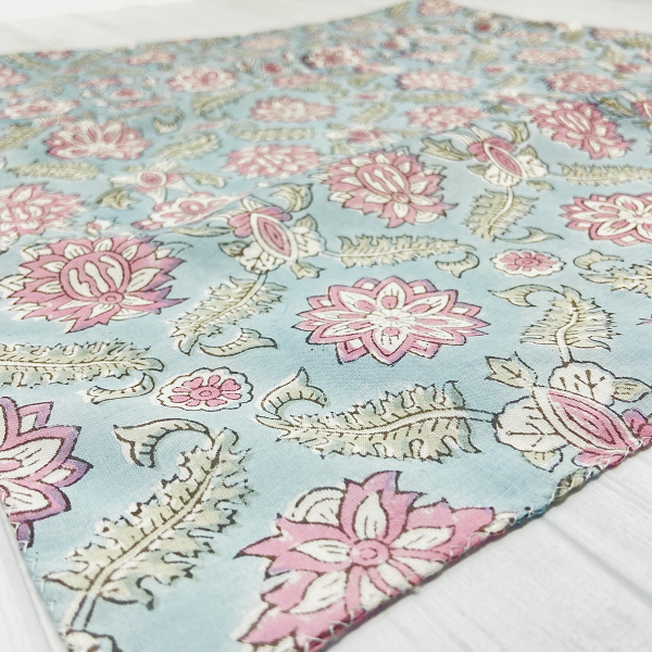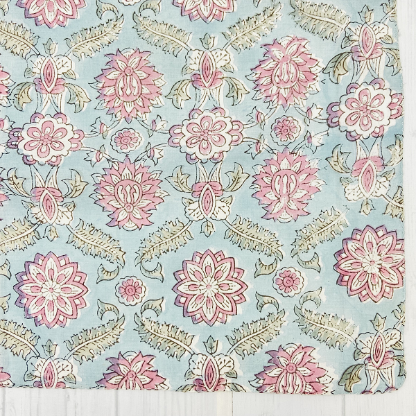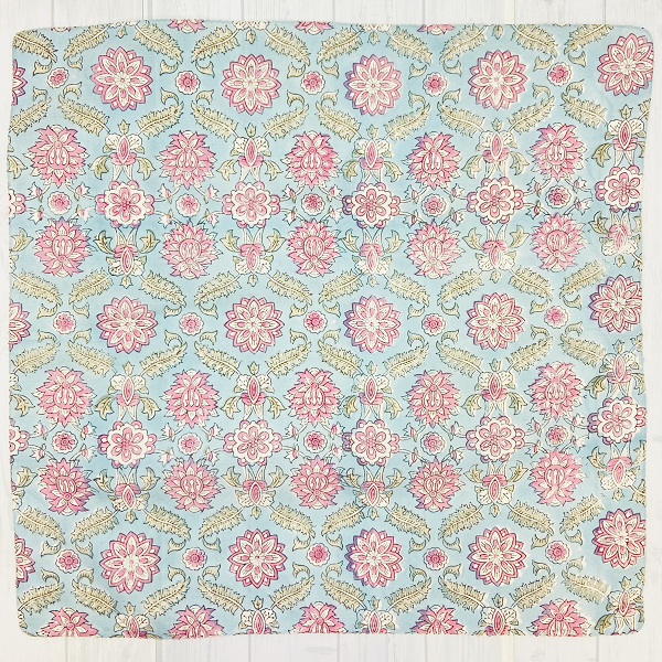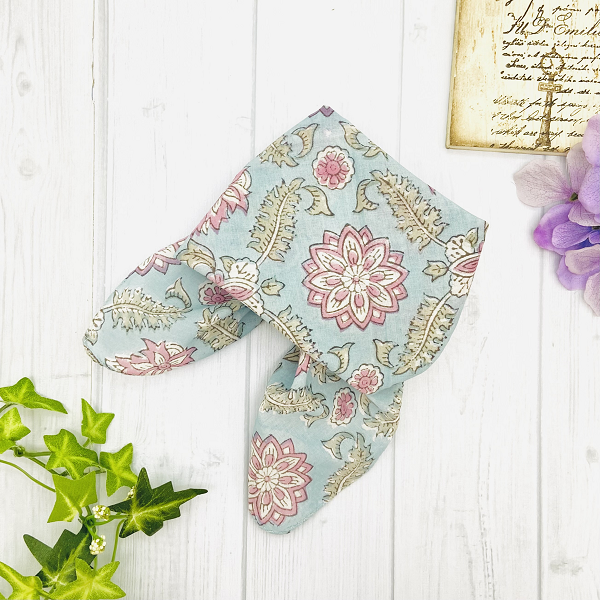 【バンダナ インド綿100% ブロックプリント ビッグフラワー 総柄 アジアン エスニック 北欧 カントリー水色 ピンク 約50cm×50cm kb055】
