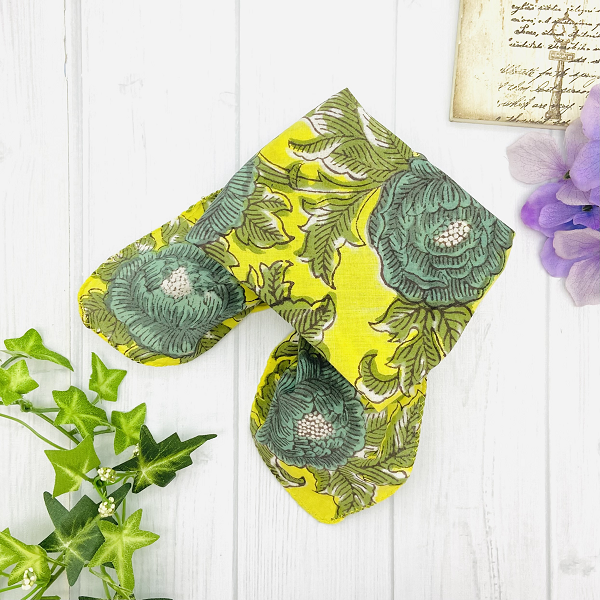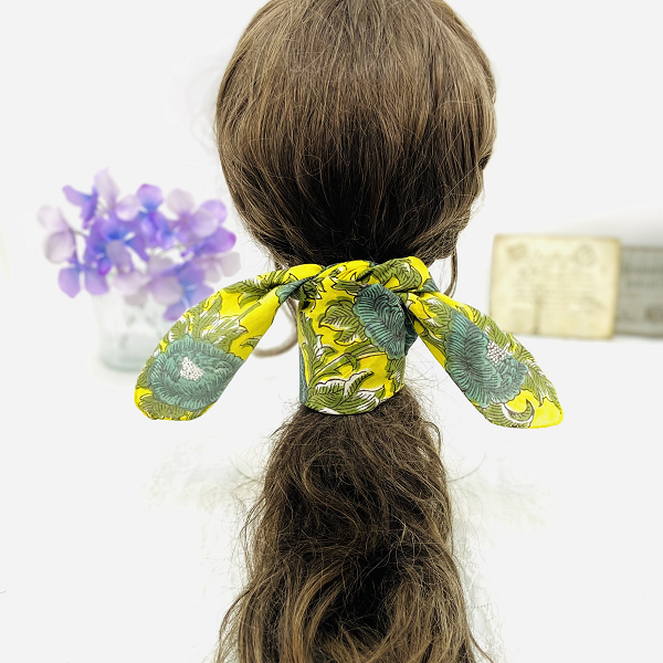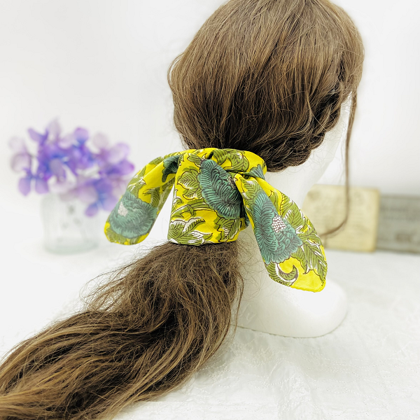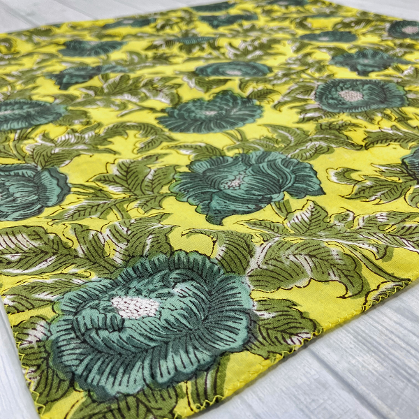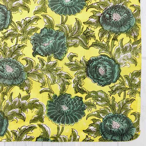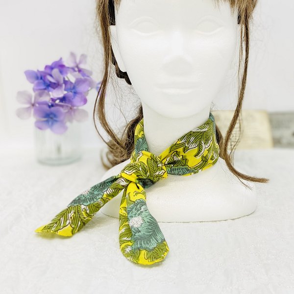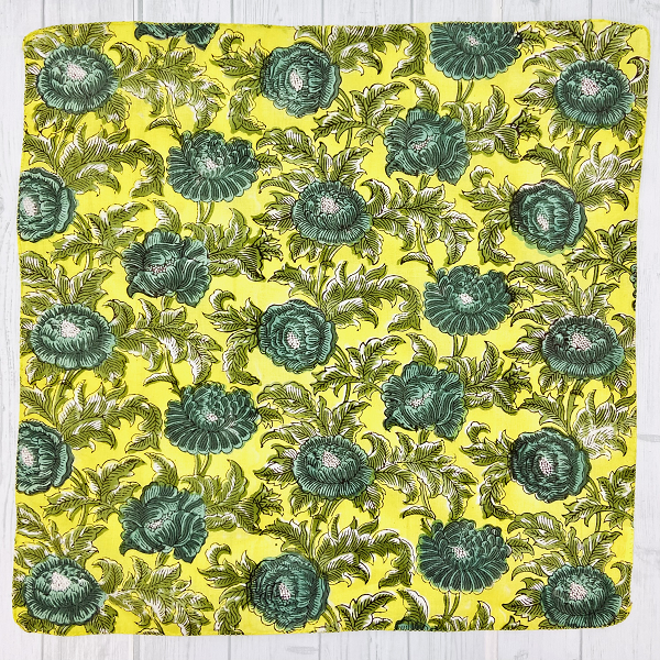 【バンダナ インド綿100% ブロックプリント ビッグフラワー ボタニカル柄 アジアン エスニック 北欧 カントリーイエロー グリーン 約50cm×50cm kb056】