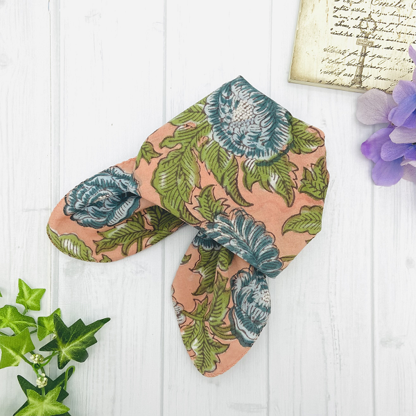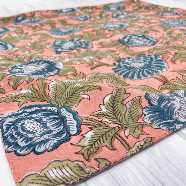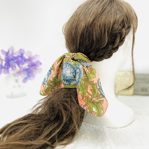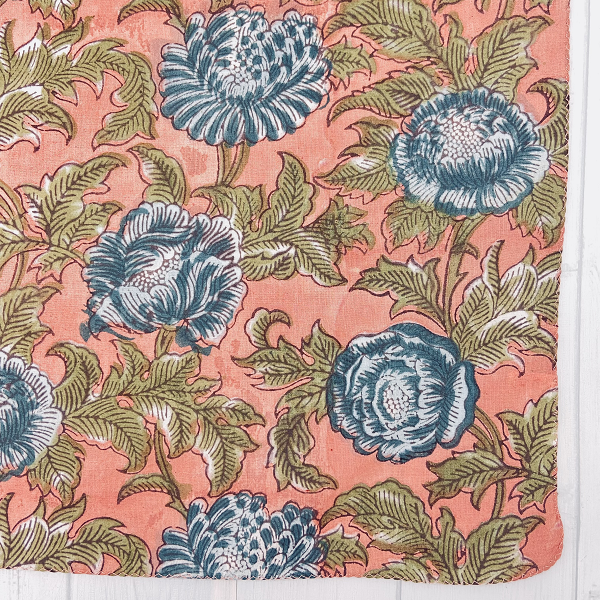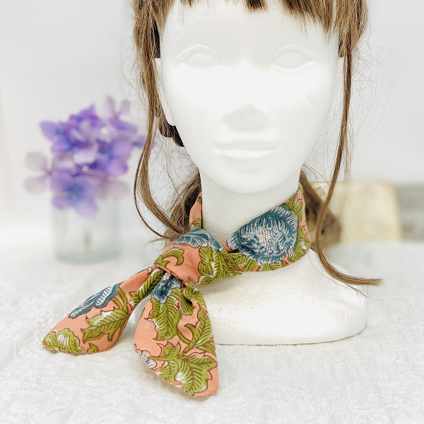 【バンダナ インド綿100% ブロックプリント ビッグフラワー ボタニカル柄 アジアン エスニック 北欧 カントリーオレンジ ブルー約50cm×50cm kb057】