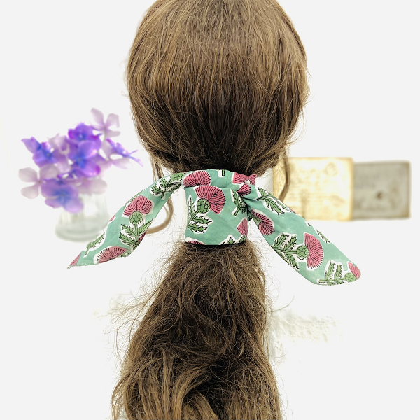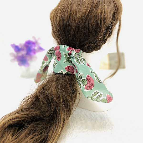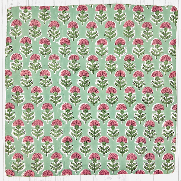 【バンダナ インド綿100% ブロックプリント アザミ 総柄 アジアン エスニック 北欧 カントリー グリーン ピンク 約50cm×50cm kb060】