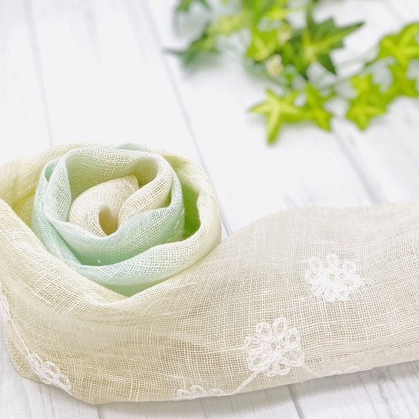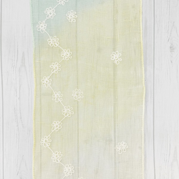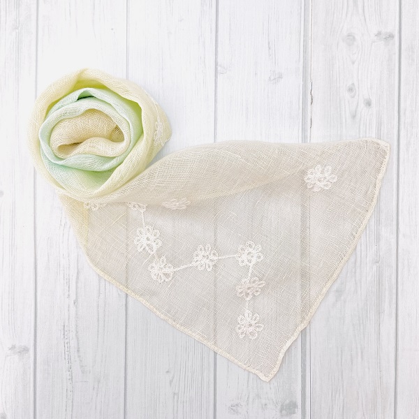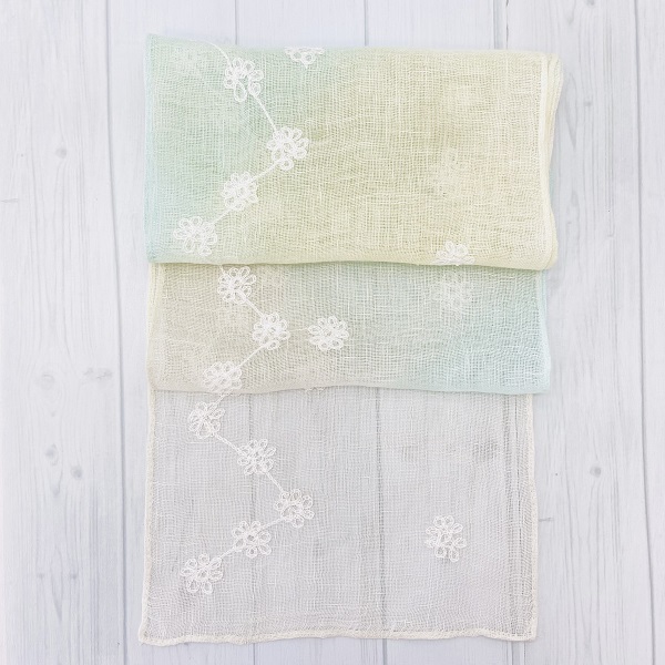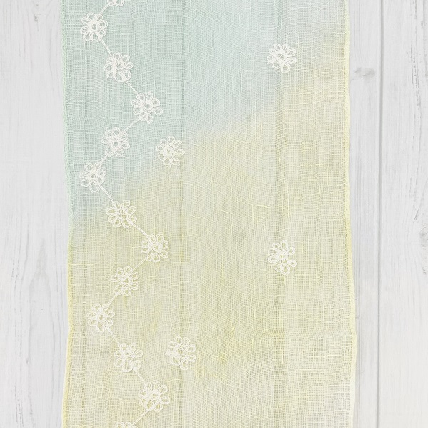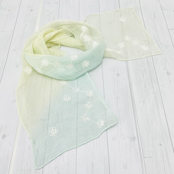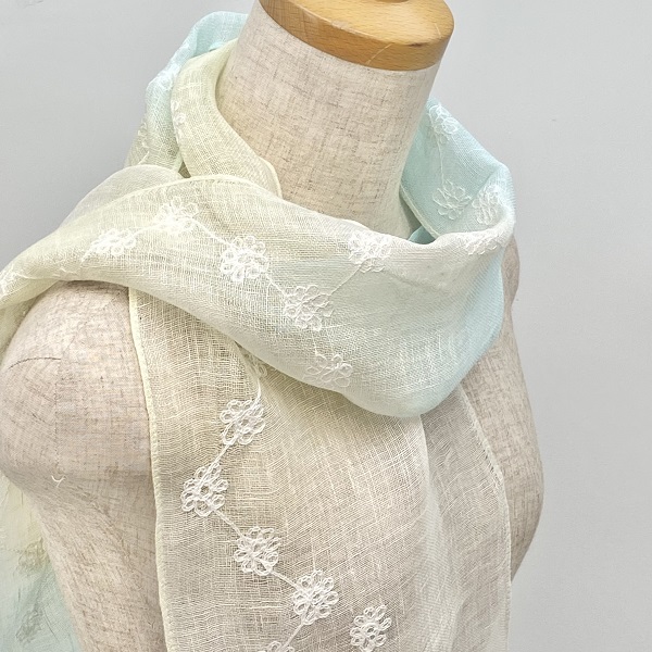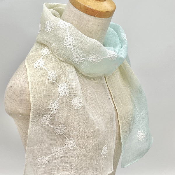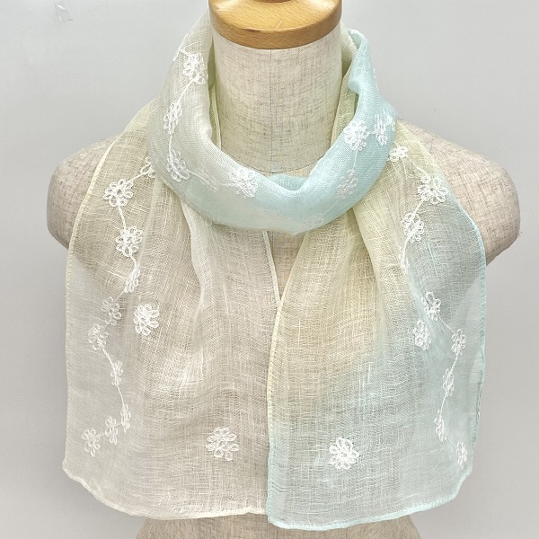 【クスス雑貨 クスス雑貨 クスス雑貨 スカーフ 麻100% グラデーションカラー フラワー刺繍 幅小さめ コンパクトサイズ 北欧 カントリー ナチュラル ブルー 140cm×22cm】