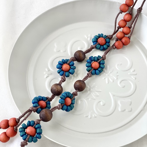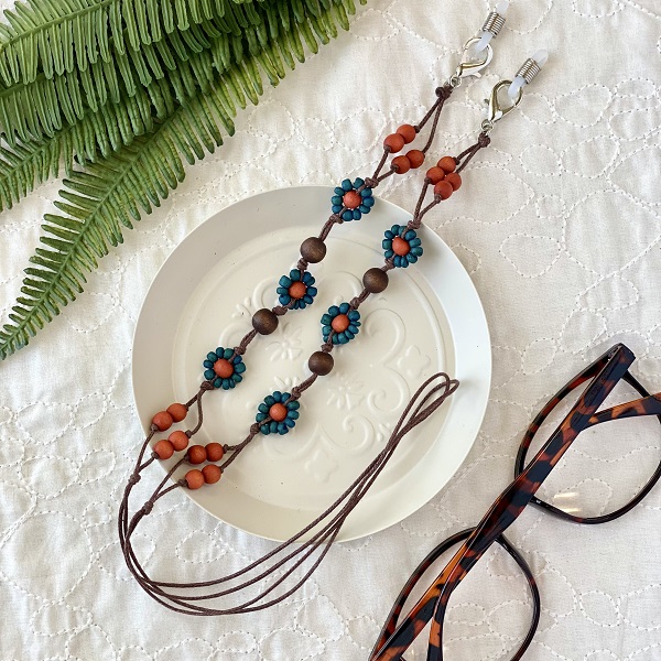 メガネチェーン ビーズ ウッドボール 花がら オレンジ ブルー 約70cm kh021