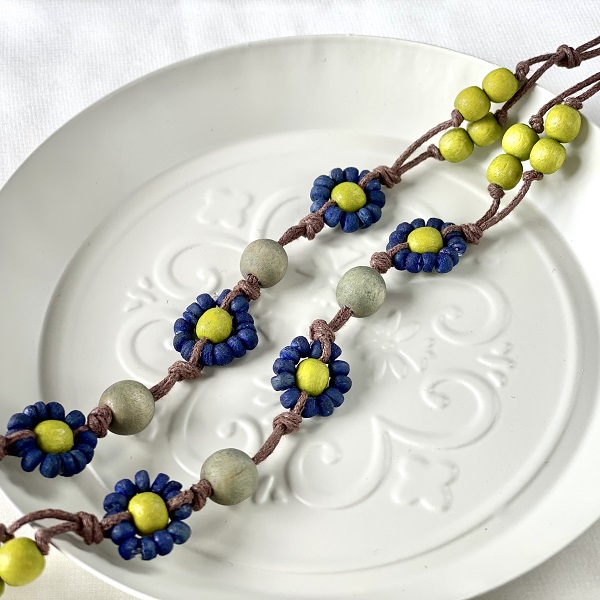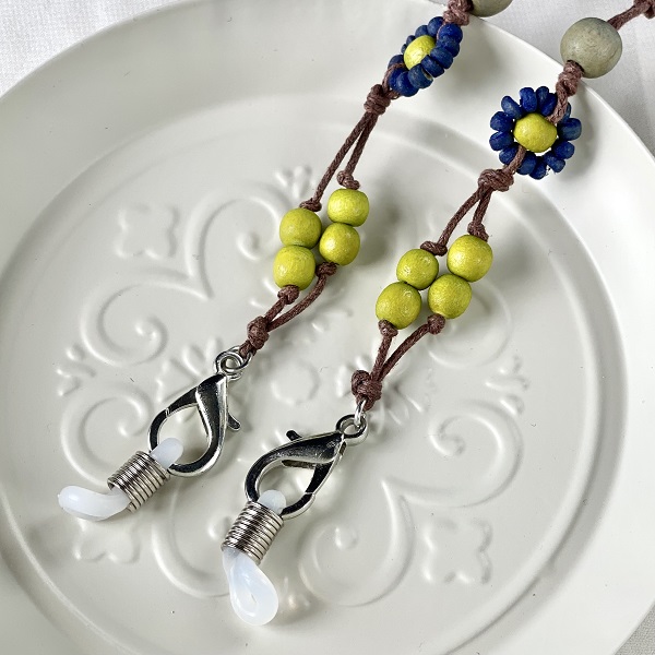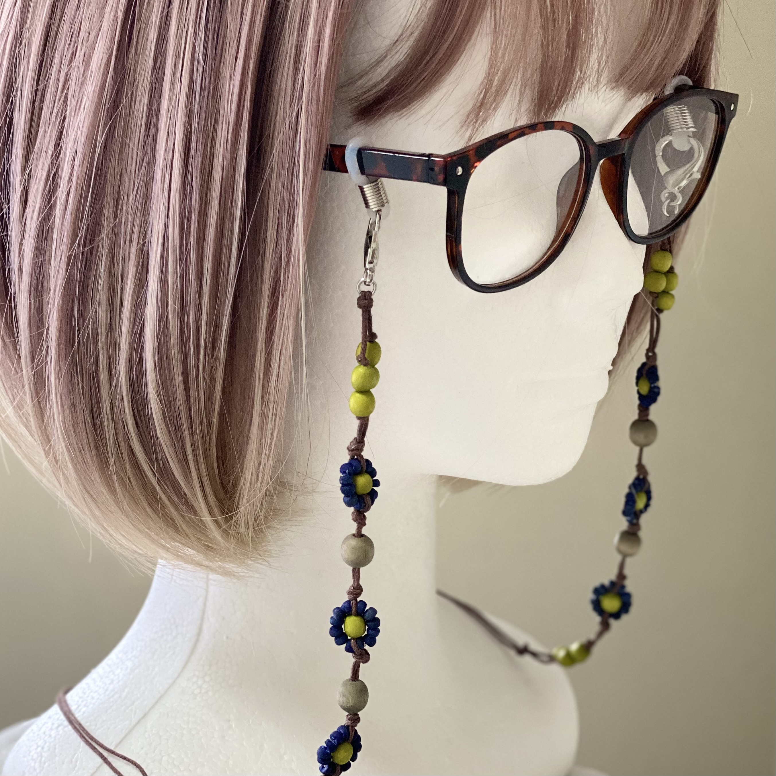 メガネチェーン ビーズ ウッドボール 花がら 黄緑 ブルー 約70cm kh022