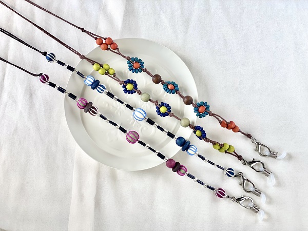 【*クスス雑貨・"メガネチェーン おしゃれ かわいい ビーズ ウッドボール レディース 花がら 黄緑 ブルー めがね 眼鏡チェーン 北欧 アジアン ギフト】