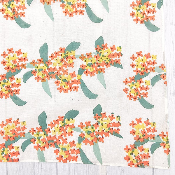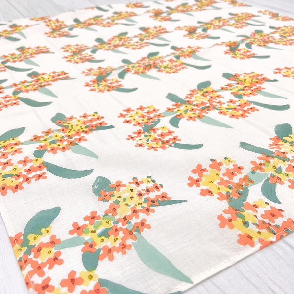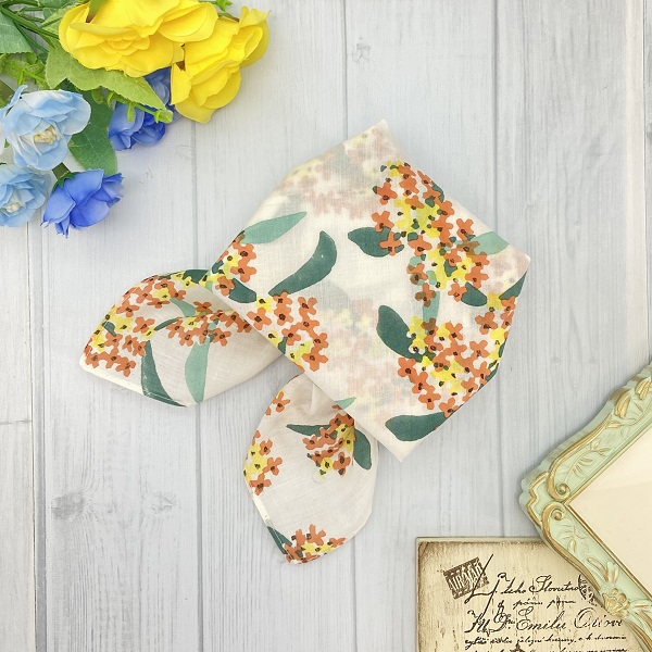可憐なオレンジ色の小さな花をいっぱい咲かせ、あたり一面を幸福感で満たす金木犀柄のハンカチ。